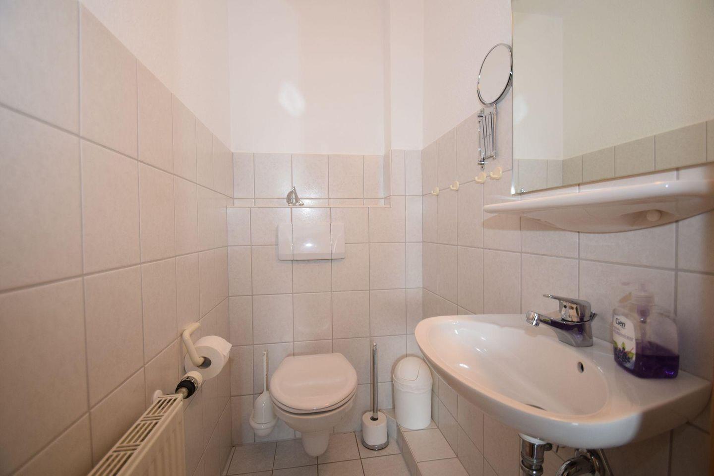 Im oberen Bereich der Wohnung (über eine Treppe zu erreichen) befindet sich 1 Schlafzimmer mit einem Ehebett sowie 1 Gäste-WC.