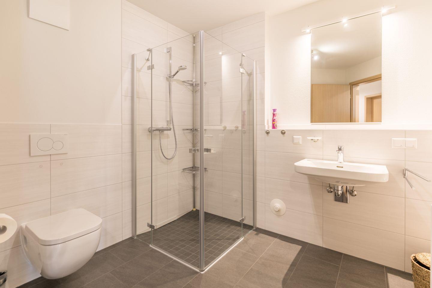bodentiefe Dusche, WC, Waschbecken, Spiegel, Fön, Handtuchtrockner, Abluft, Schrank mit viel Stauraum und Ganzkörperspiegel