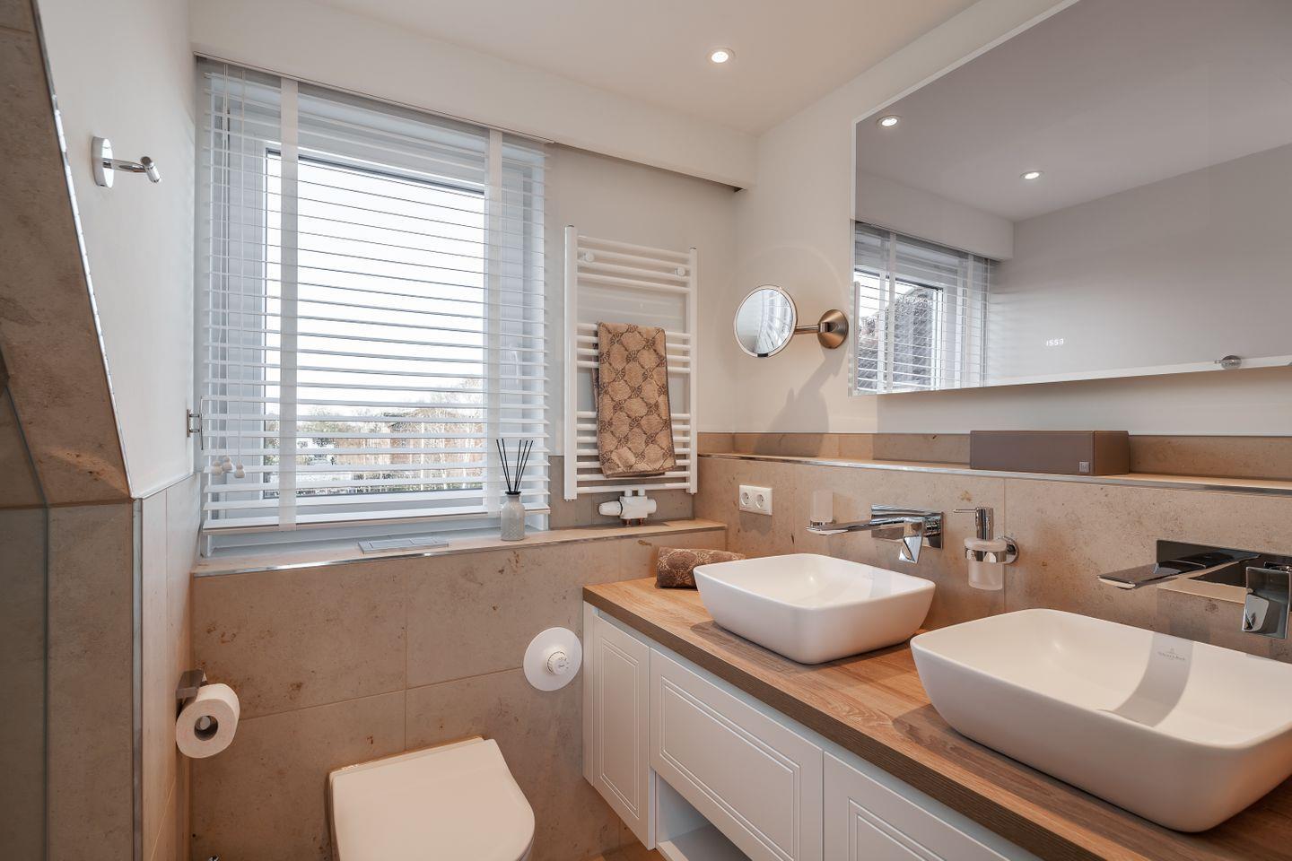Bad: Dusche bodengleich, Doppelwaschbecken mit Unterschrank, WC, Föhn, Fenster mit Jalousie, Handtuchtrockner, Spiegel, Kosmetikspiegel