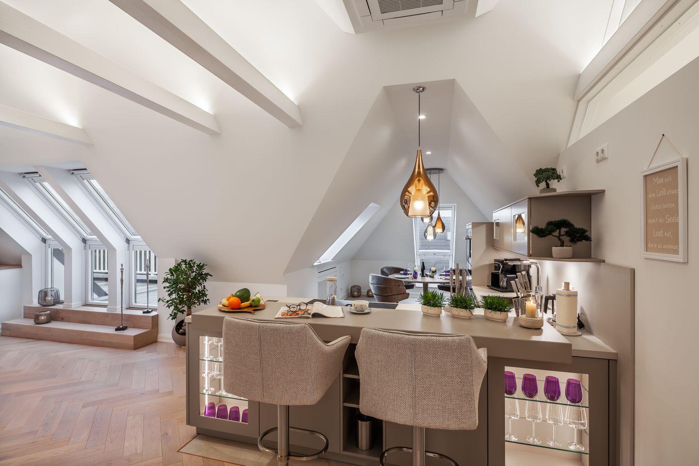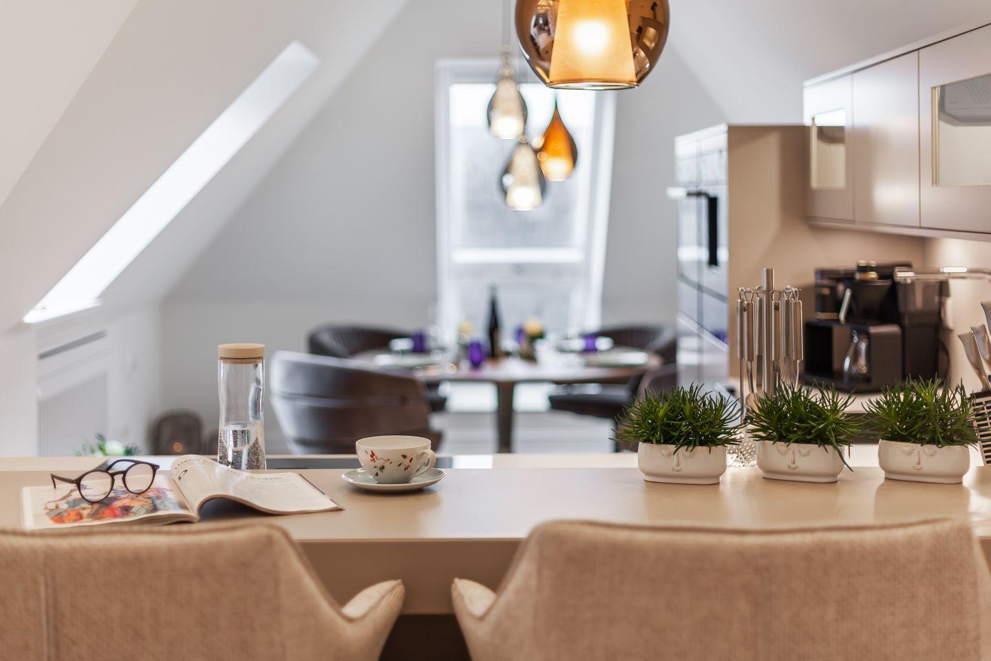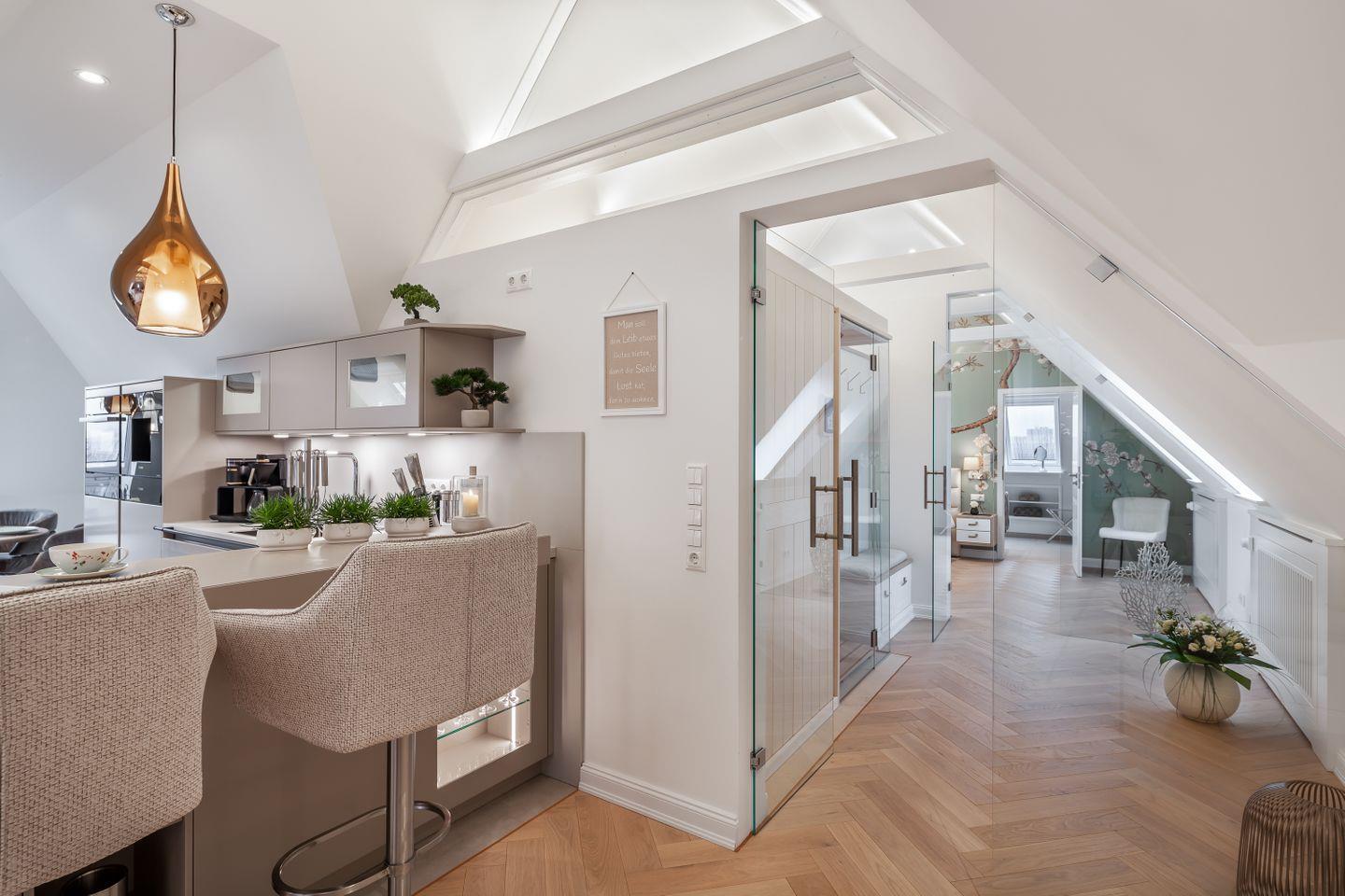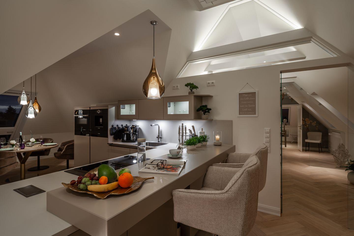 Das Interieur inszeniert dezente Eleganz und handverlesenes Design: ein maßgefertigter Esstisch mit Stühlen von JOOP!, mundgeblasene Lichtobjekte von Cangini & Tucci und eine hochwertige Küche, die inspiriert statt nur zu funktionieren. Die integrierte Trinkwasserstation liefert Sprudel, Medium oder Still auf Knopfdruck und macht Kistenschleppen überflüssig – perfekt für lange Kochabende und entspannte Frühstücke mit Meerluft.