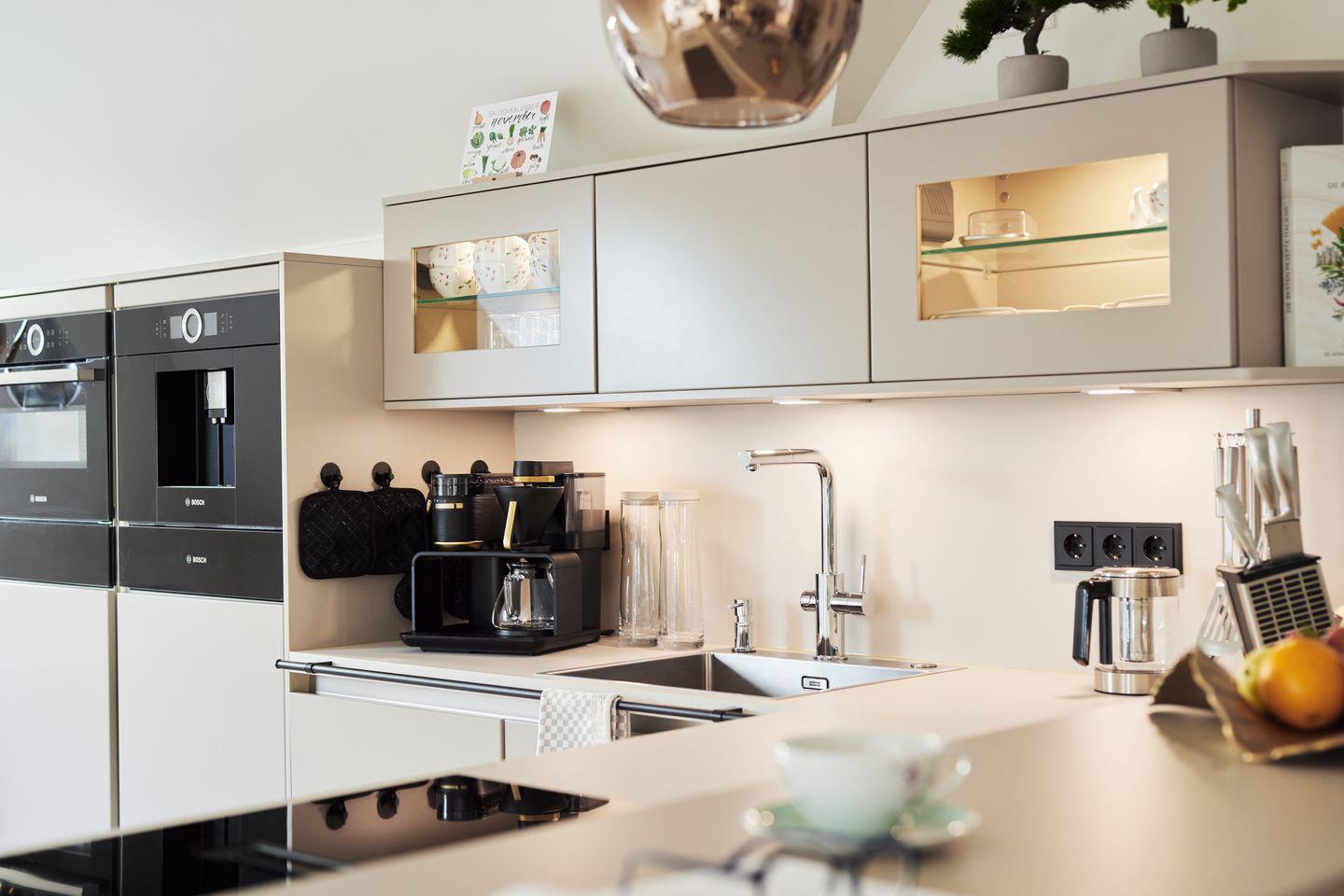 Küche: Elegante Küchenzeile mit Tresen und 2 Lounge-Hockern, Backofen, Kühlschrank, Gefrierschrank mir 4 Schubladen, integrierter Bosch-Kaffeevollautomat, Geschirrspüler, Toaster, Wasserkocher, Eierkocher, Induktionsherd mit integriertem Kochfeldabzug, Wärmeschublade, Melitta Epos Filterkaffeemaschine, Groe Blue Home Trinkwasserstation, Essplatz mir 4 Sitzgelegenheiten, Klimaanlage