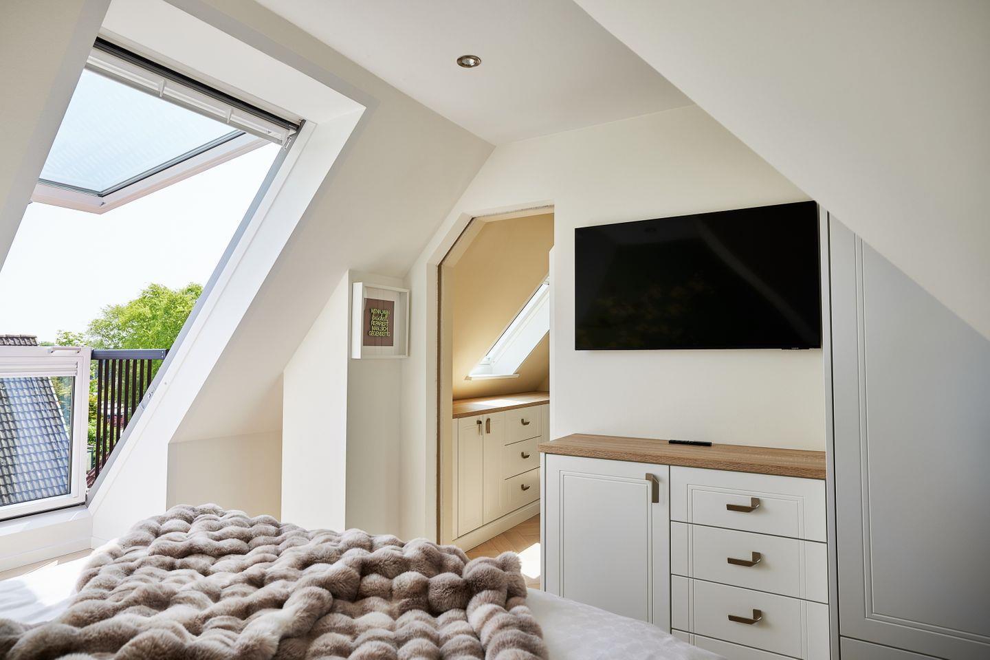 Schlafzimmer: Boxspringbett (200cm x 180cm), Flachbild Smart-TV, Kommode, Kleiderschrank, Fenster mit Plissee und Verdunkelungsjalousie, Nachtkonsolen und Nachtleuchten