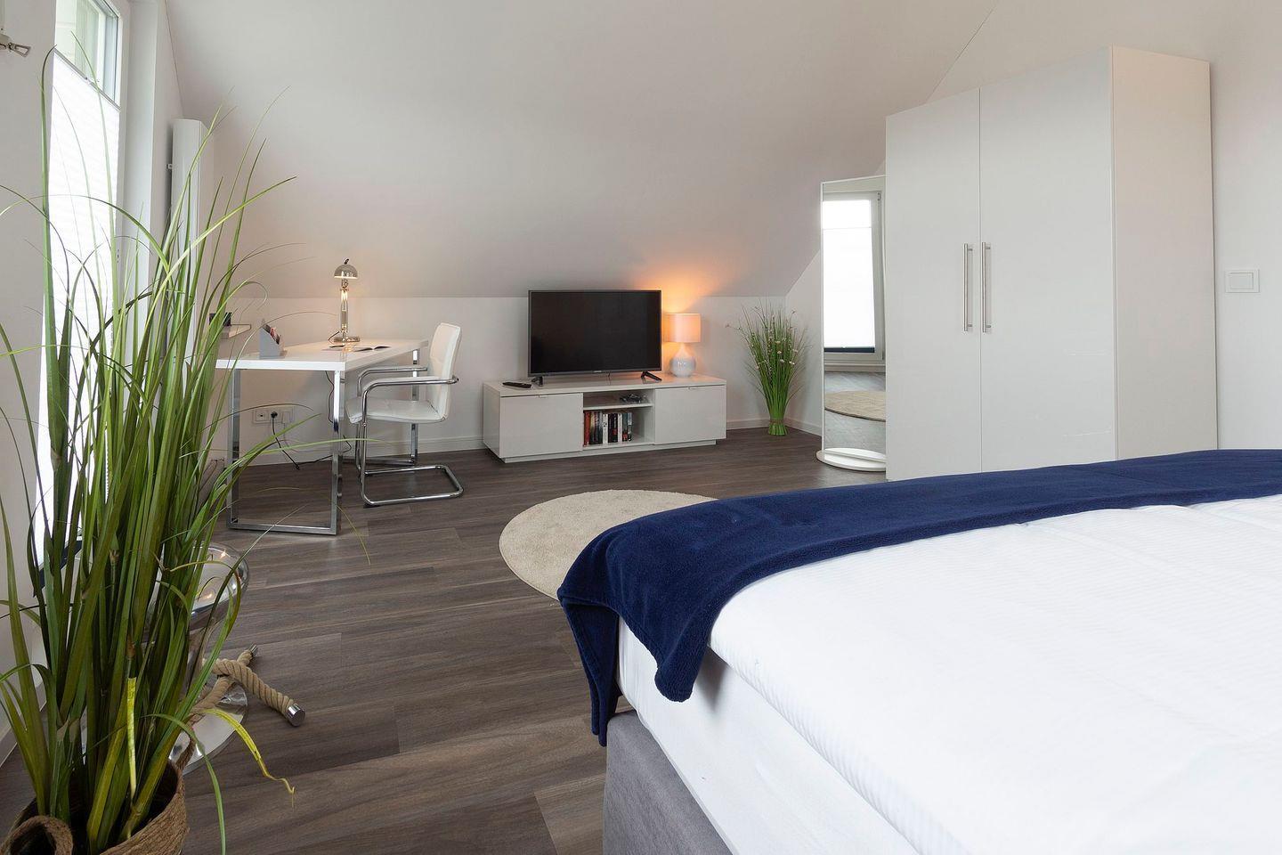 Im Obergeschoss befinden sich ein weiteres Duschbad und zwei Schlafzimmer. Die Bilder sprechen für sich. Die beiden oberen Schlafzimmer sind jeweils mit einem Fernseher ausgestattet und ein Schreibtisch, der auch zum Postkarten schreiben genutzt werden kann, ist vorhanden. Alle drei Schlafzimmer verfügen über hochwertige Boxspringbetten mit Kuschelfaktor.
