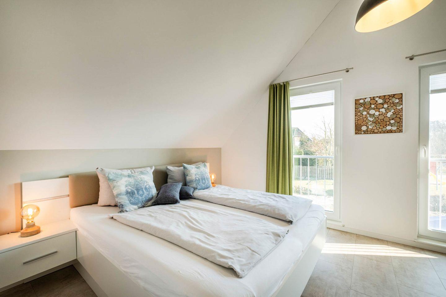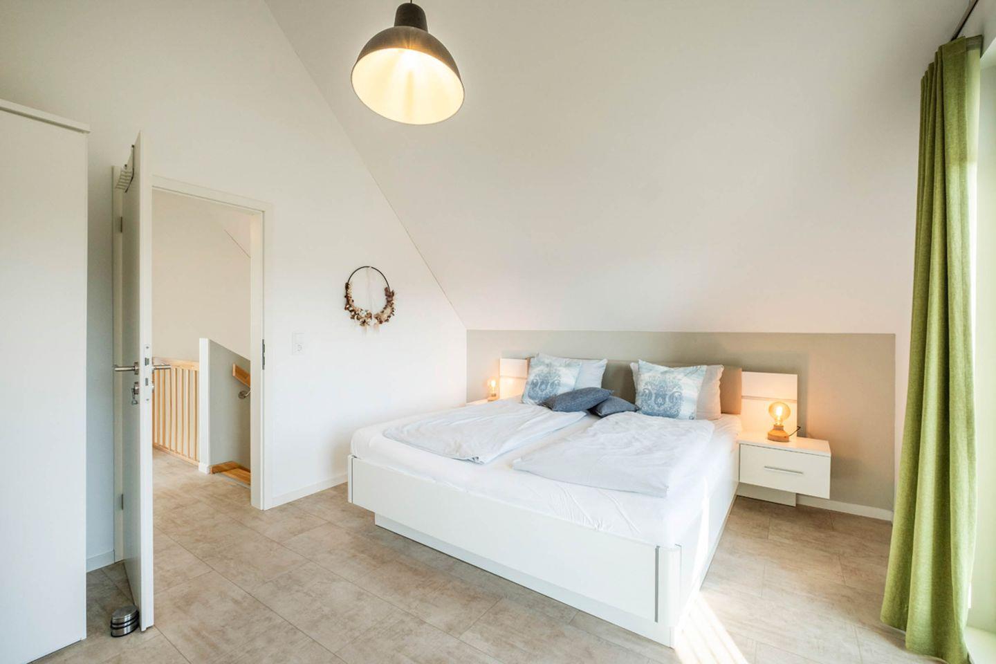 Über eine Massivholztreppe erreicht man das Dachgeschoss. Unter der Treppe kann ein Abstellraum genutzt werden. Das Dachgeschoss verfügt über zwei mit Doppelbetten ausgestattete Schlafzimmer und ein zweites Bad mit Badewanne. Beide Schlafzimmer sind mit Smart-TV-Geräten ausgestattet.