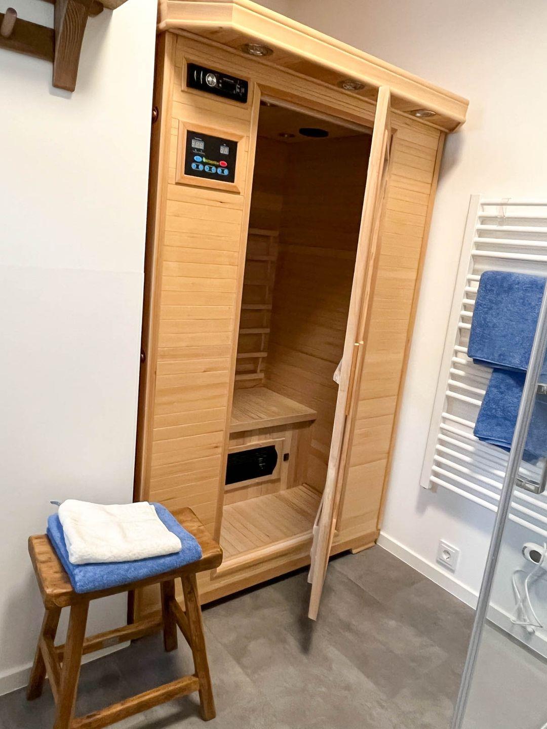 Im Erdgeschoss befindet sich ein großzügiges Bad mit ebenerdiger Dusche. Behagliche Wärme an kühlen Tagen gewährleistet eine moderne Zentralheizung, im Erdgeschoss mit Fußbodenheizung. Gemütliche Stunden und Entspannung bieten ein Kaminofen und eine Infrarot-Sauna.