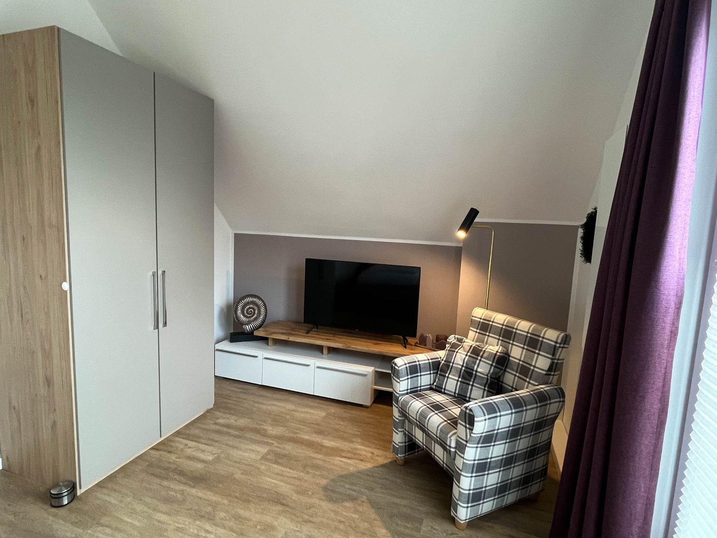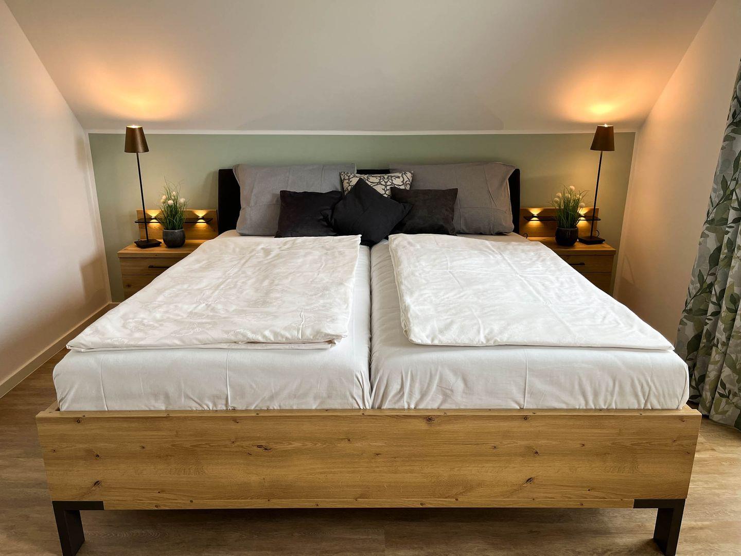 Über eine Massivholztreppe erreicht man das Dachgeschoss. Unter der Treppe kann ein Abstellraum genutzt werden. Das Dachgeschoss verfügt über zwei mit Doppelbetten ausgestattete Schlafzimmer und ein zweites Bad mit Badewanne. Beide Schlafzimmer sind mit Smart-TV-Geräten ausgestattet.