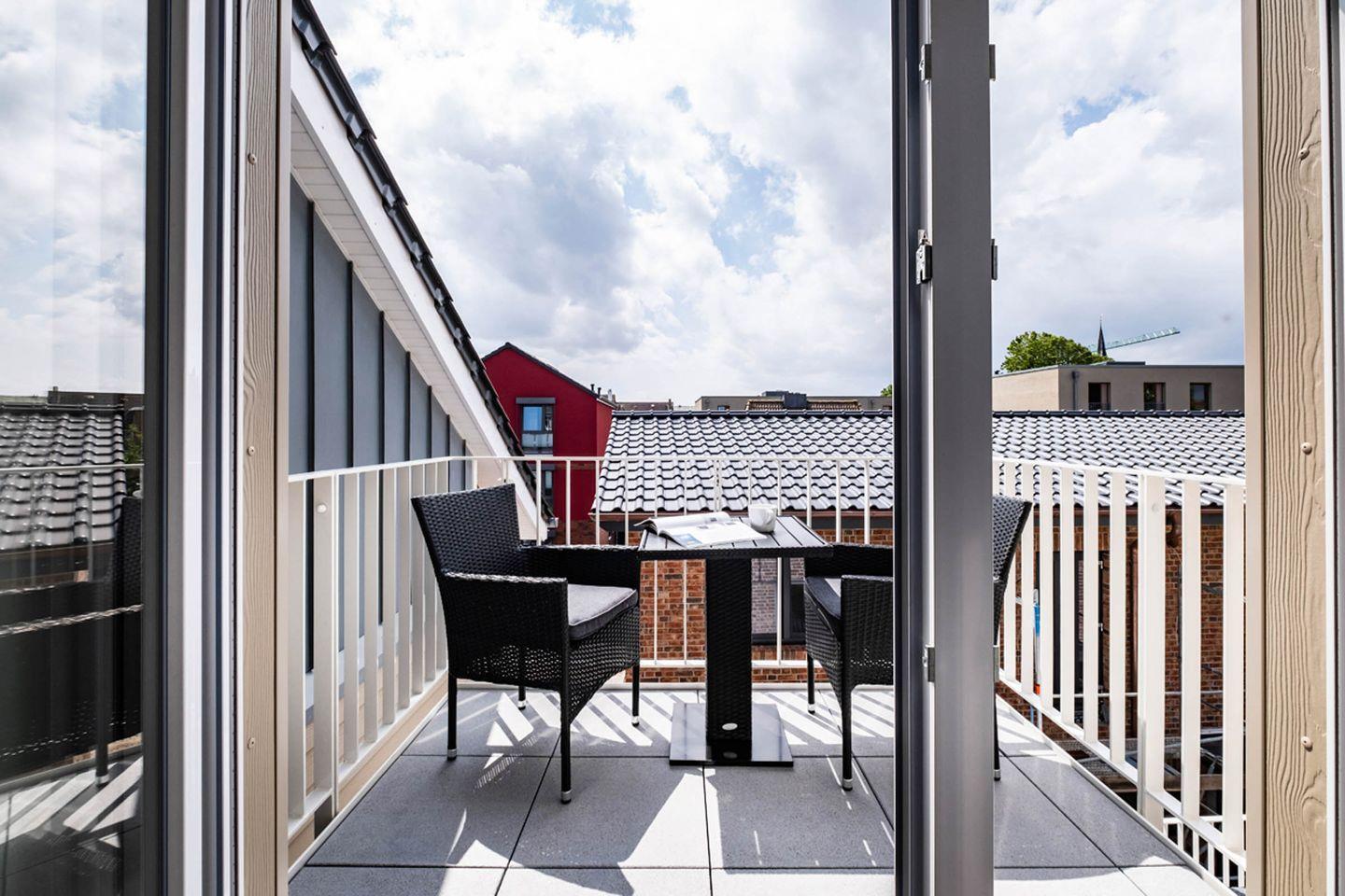 Balkon: Westliche-Lage mit hochwertigen Balkonmöbeln und Sonnenschirm