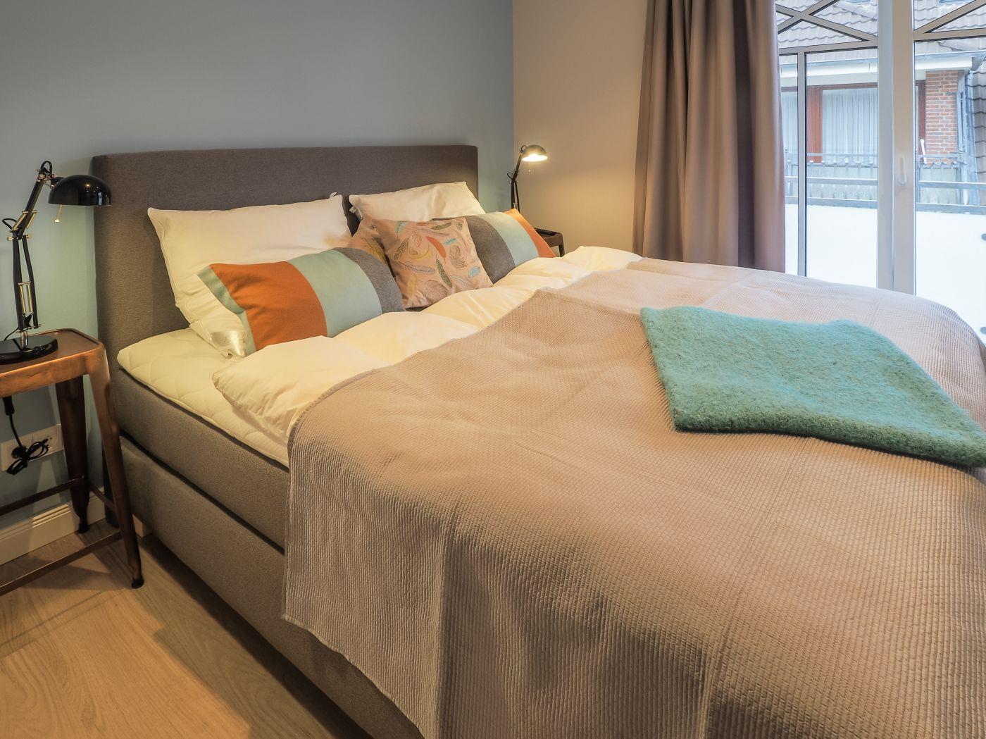 Der zweite Balkon grenzt an das exklusive Schlafzimmer, in dem viel Wert auf Schlafkomfort gelegt wird (Hinweis: Auf den Betten finden Sie durchgehende Topper, ein großes Bettlaken wird benötigt).