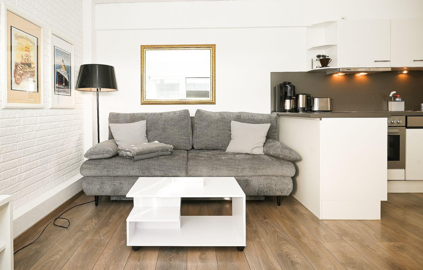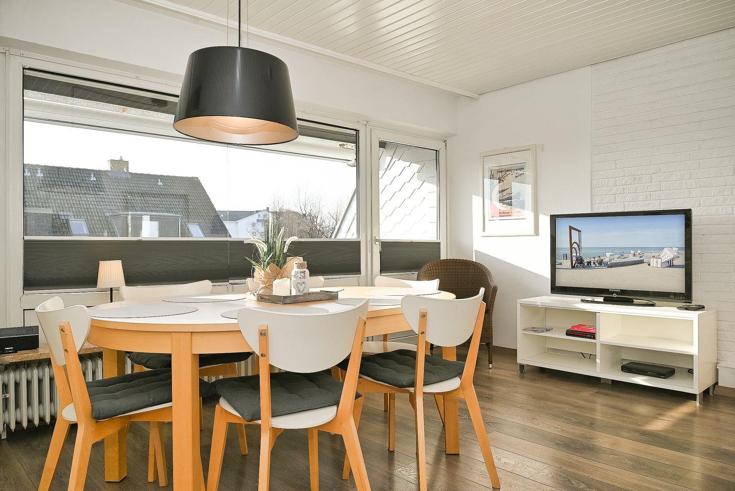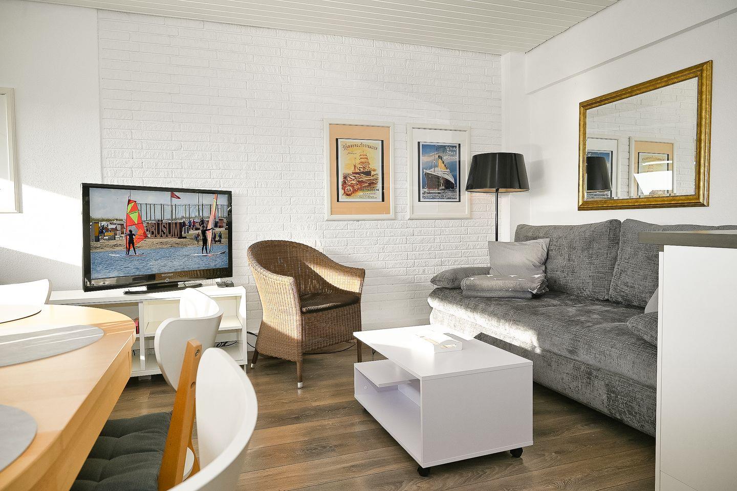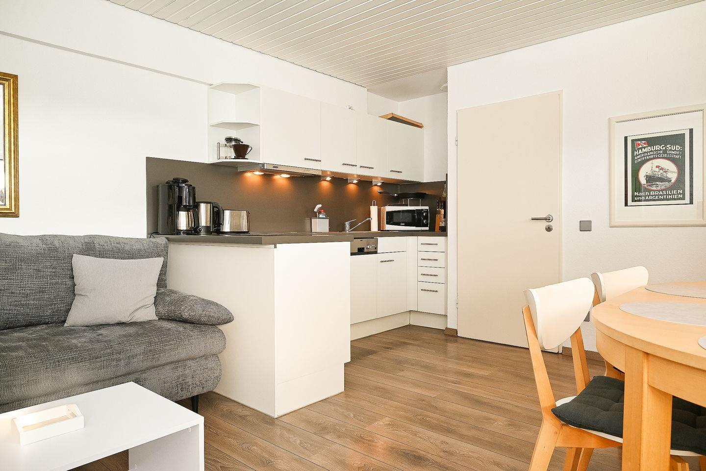 Der helle Wohnbereich mit Sofaecke, Sessel, Esstisch und TV lädt zum Entspannen ein und bietet viel Platz für gemeinsame Stunden. Fernseher, Radio sowie kostenfreies WLAN sorgen für Unterhaltung und Konnektivität. Die offene Küche ist vollständig ausgestattet und ermöglicht es Ihnen, auch im Urlaub flexibel und unabhängig zu sein. Das helle Bad ist mit Fenster, Dusche und Badewanne, sowie Ganzkörperspiegel funktional und gepflegt eingerichtet. Ein Haartrockner steht ebenfalls zur Verfügung.