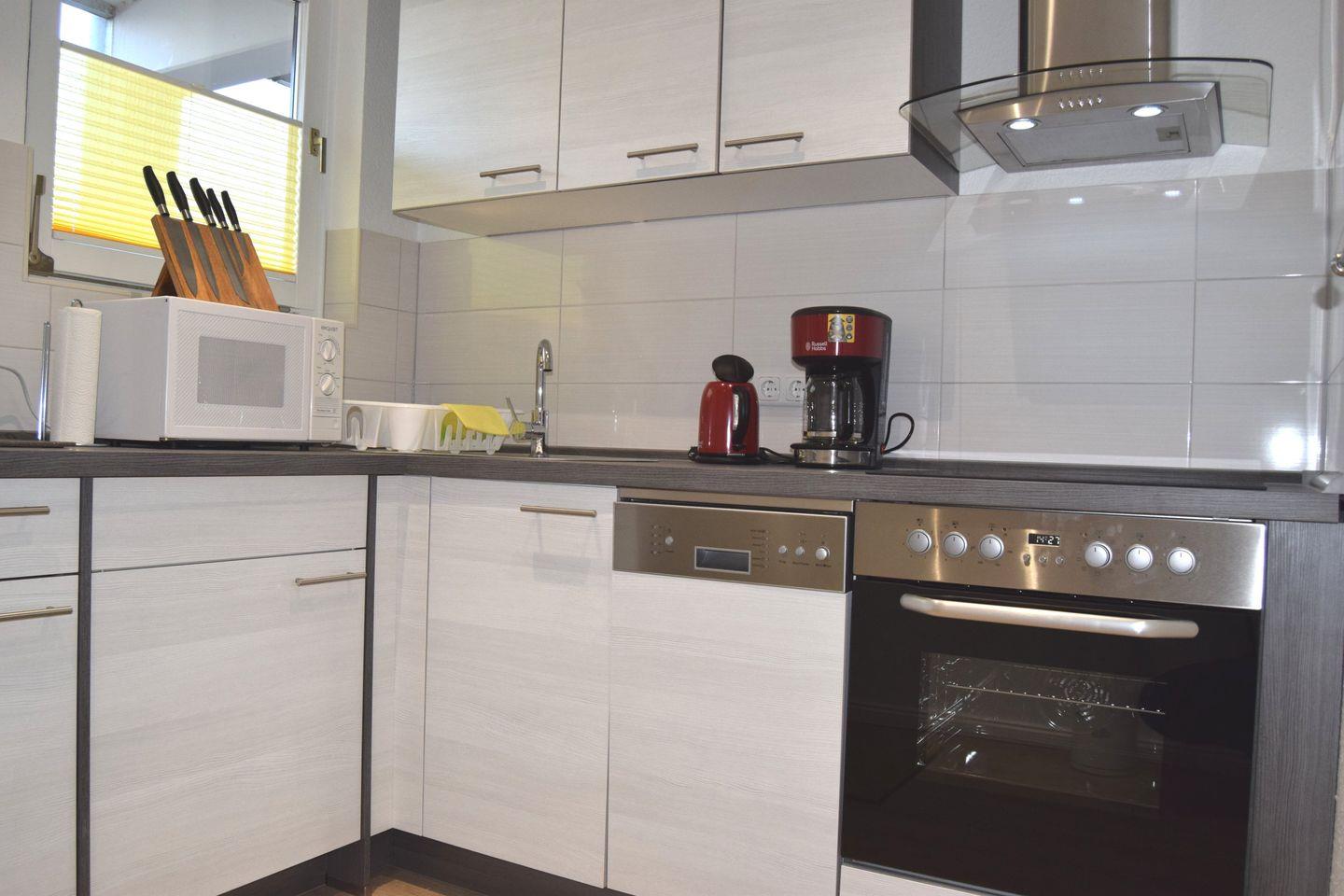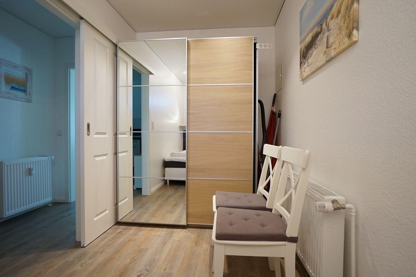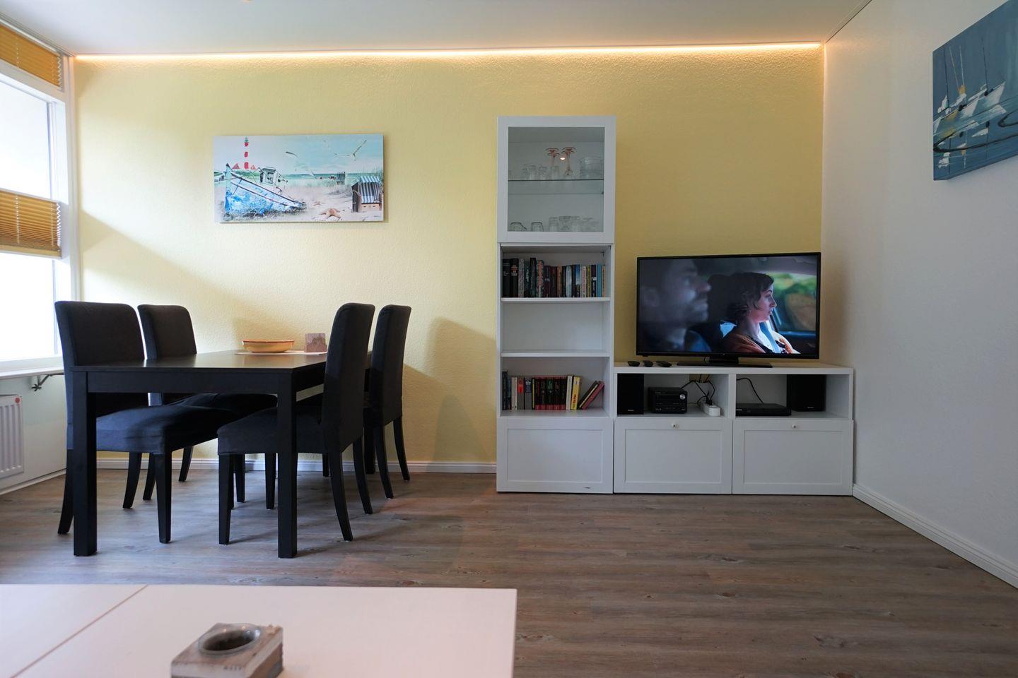 Aufgeteilt ist sie in einen großzügigen Wohn- und Essbereich, ein Schlafzimmer und ein Bad. Vor allem im Wohnzimmer können Sie es sich wunderbar gemütlich machen und nach einem erlebnisreichen Tag an der Küste ganz entspannt die Füße hochlegen.