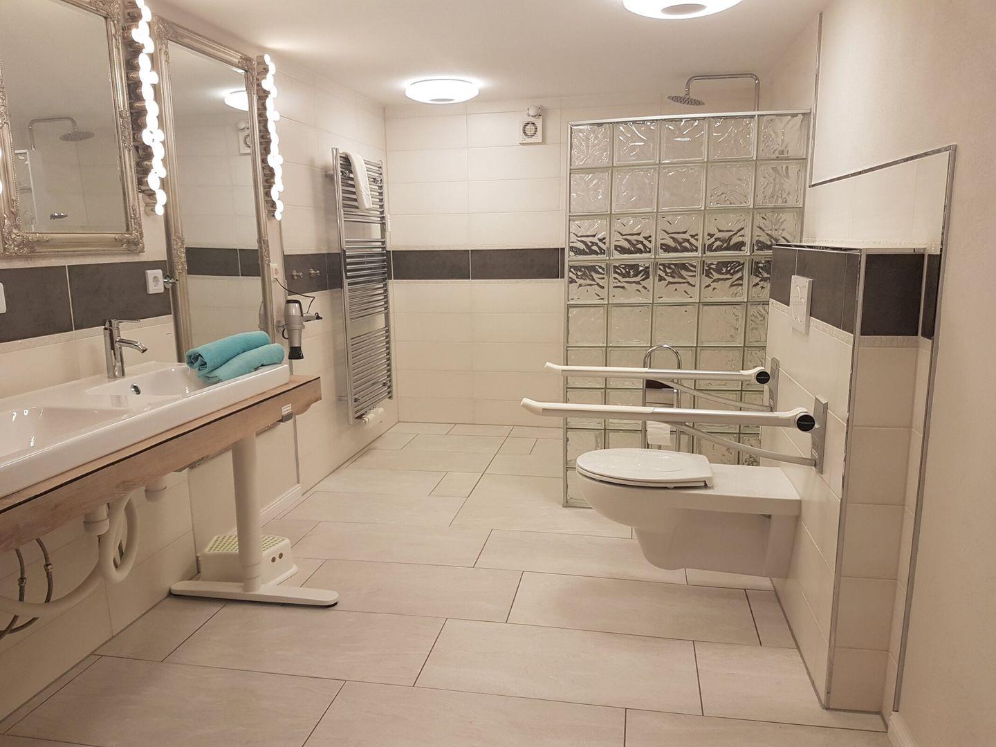 Das Badezimmer bietet ebenfalls schwellenlosen Zugang (Türbreite 0,81 cm). Hier finden Sie eine große (3 m²) ebenerdige Dusche. An der Toilette befindet sich an jeder Seite ein Griff. Hier wurde ein barrierefreier Traum erschaffen.
