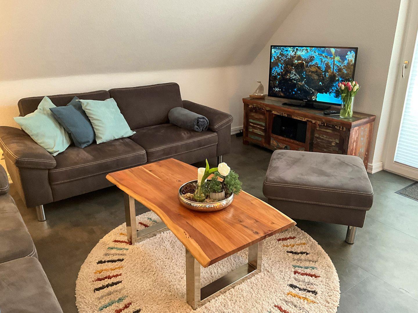 Damit Sie einen rundum erholsamen Urlaub an der Nordsee verbringen können, haben wir die gesamte Wohnung 2018 kernsaniert. Der großzügig geschnittene Wohn- und Essbereich eignet sich hervorragend für gemeinsame Stunden nach einem aufregenden Tag am Meer. Insgesamt drei Schlafzimmer gehören zur Wohnung. Zwei von ihnen verfügen über ein 1,80 Meter breites Bett, eines ist mit einem 1,60 Meter breiten Bett ausgestattet. In allen drei Schlafzimmern finden Sie einen Fernseher.