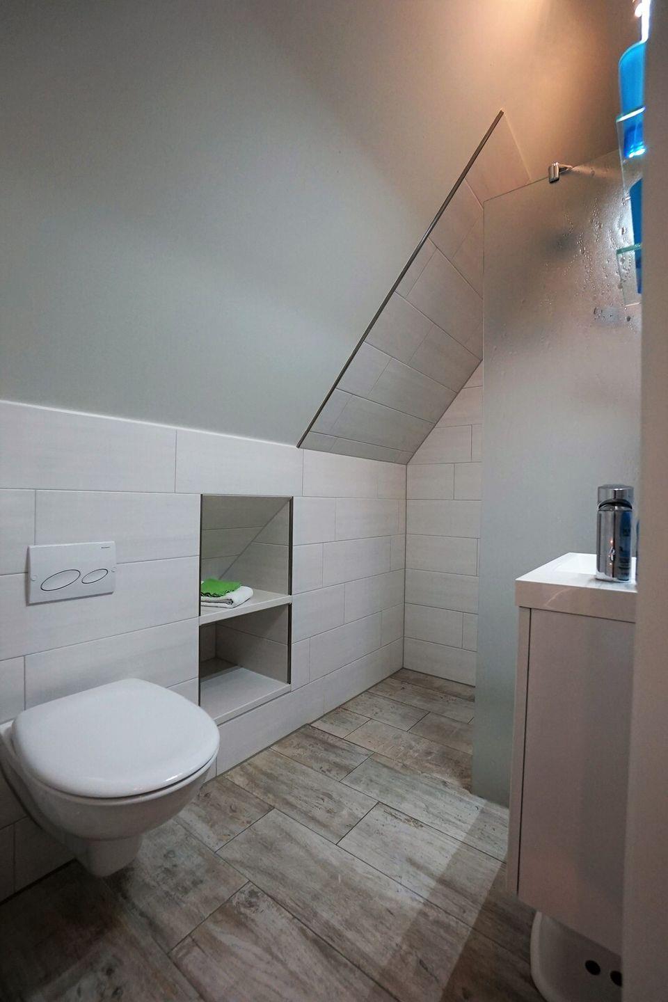 Bett. Zusätzlich ist ein Badezimmer mit Dusche auf der ersten Etage zu finden.