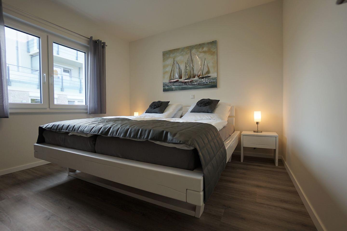 Die Ferienwohnung wurde 2019 fertiggestellt und bietet Platz für bis zu vier Personen. Aufgeteilt ist sie in zwei moderne Schlafzimmer mit je einem Doppelbett, einem Fernseher und Außenjalousien.