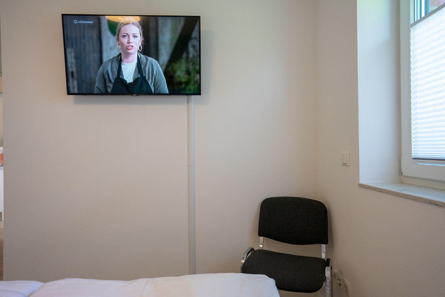 Eines der Schlafzimmer ist mit einem Fernseher ausgestattet. In der gesamten Wohnung gibt es Außenjalousien.