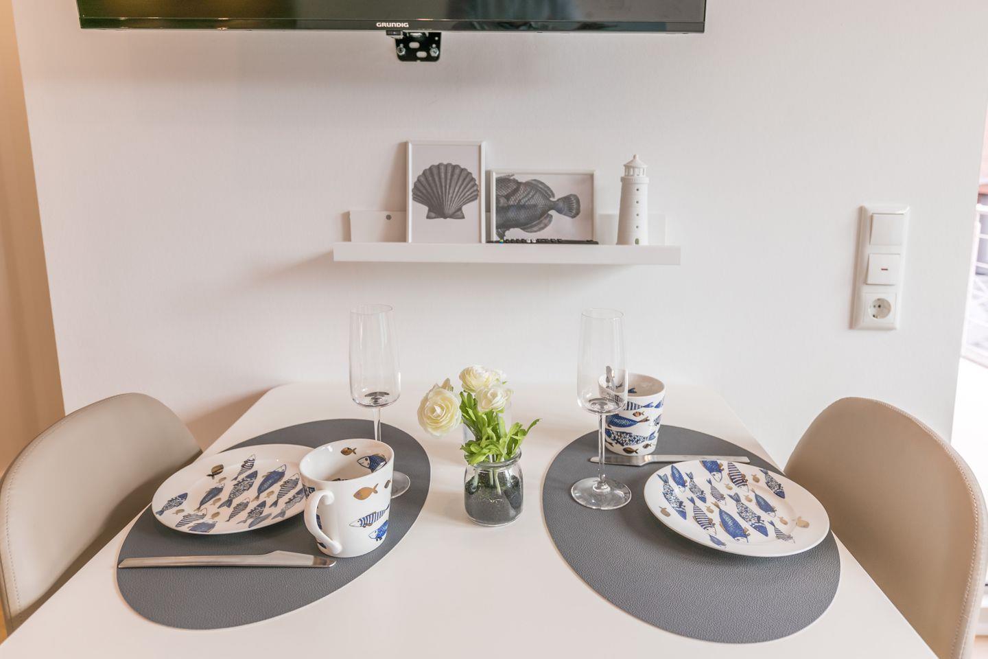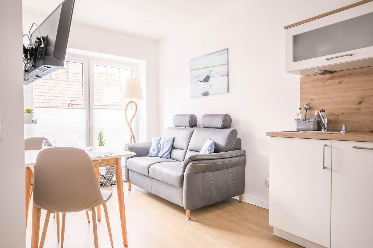 Sofa, Flachbild TV, DAB+ Radio, Esstisch mit 2 Stühlen, Plissee, Außenrollo, Zugang zum Balkon