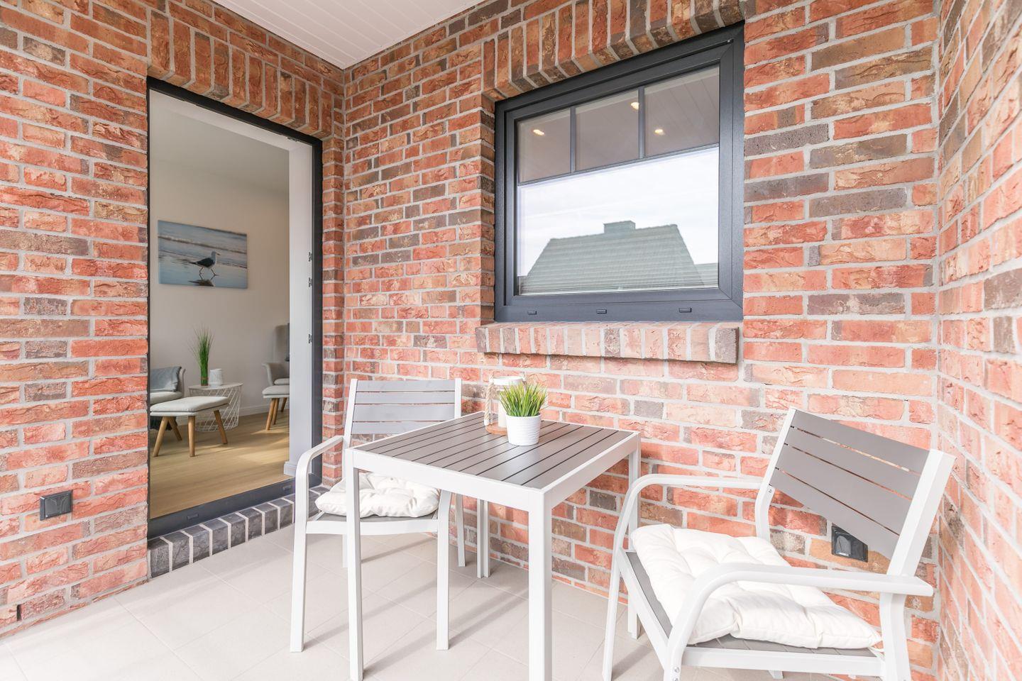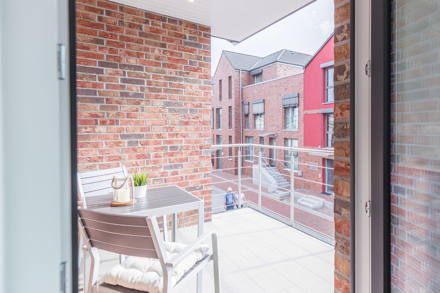 überdachter Balkon mit Balkonmöbel und Sichtschutz in Geländerhöhe, Garderobe, 1 offener kostenloser Garagenparkplatz (2,47m breit und 5,00m lang), Fahrradabstellraum abschließbar, Bücher, Wäsche optional dazu buchbar