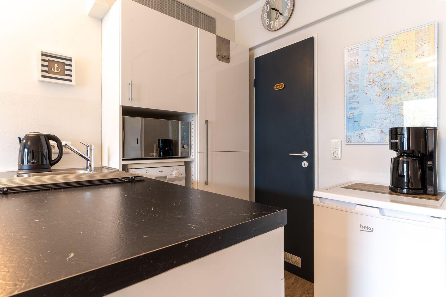 Die ca 30 m2 große 1-Raum-Wohnung befindet sich im Erdgeschoß eines Mehrparteien-Hauses. Über die Terrasse gelangen Sie in den Wohn-Küchen und Schlafbereich. Die Küche verfügt über einen Geschirrspüler, sowie einer Mikrowelle mit Grillfunktion und einem kleinen Kochfeld. Das Schlafsofa hat eine Größe von 1,80 x 2,00 Meter.Das moderne Duschbad bietet ausreichend Platz für Ihre Utensilien.