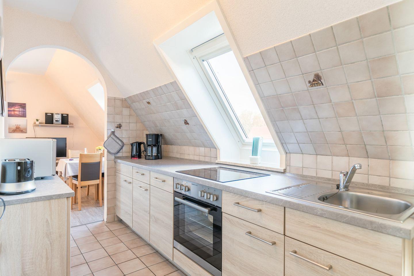 Einbauküche, Herd mit Cerankochfeld, Backofen, Kühlschrank mit Gefrierfach, Geschirrspüler, Kaffeemaschine, Microwelle, Wasserkocher, Toaster, Dachfenster mit Verdunkelungsjalousie