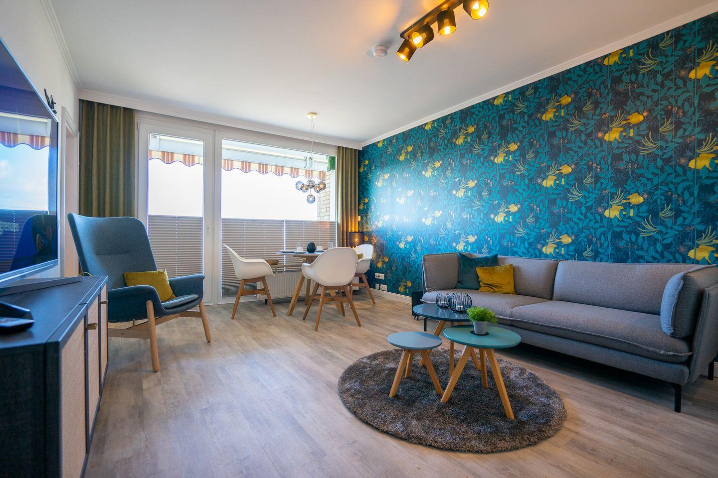 Hier finden Sie den 2. Smart-TV. Durch das Wohnzimmer gelangen Sie in die moderne Küche.