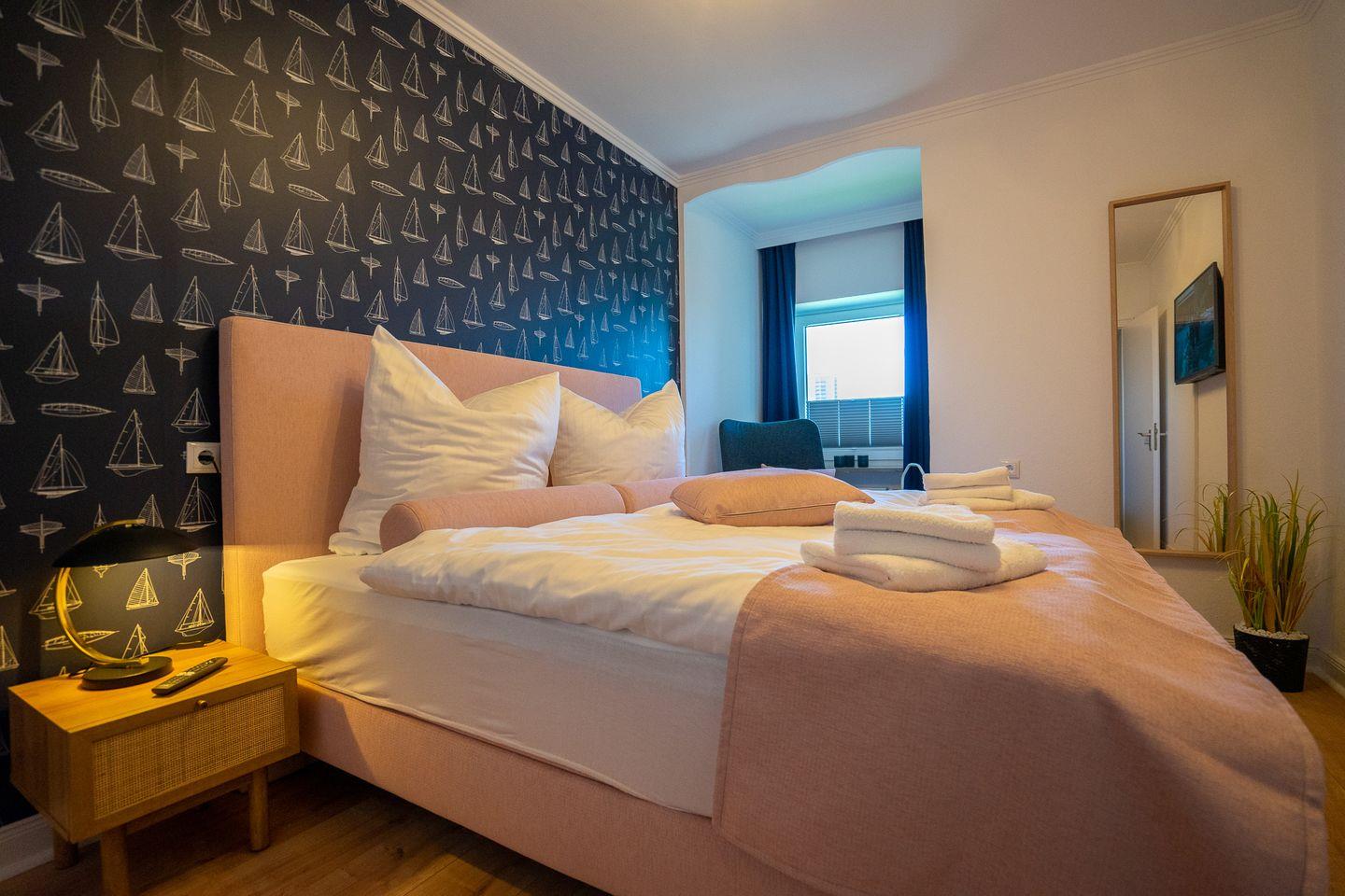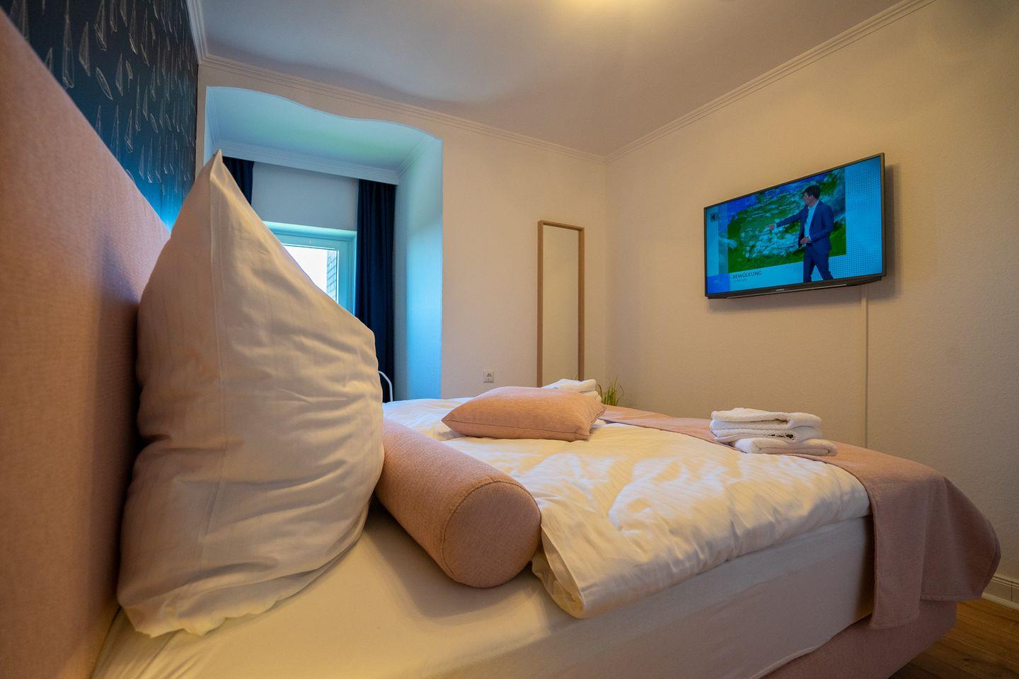 Im Schlafzimmer finden Sie ein Boxspringbett (1,80 x 2,00). Hier ist auch ein Smart-TV installiert.