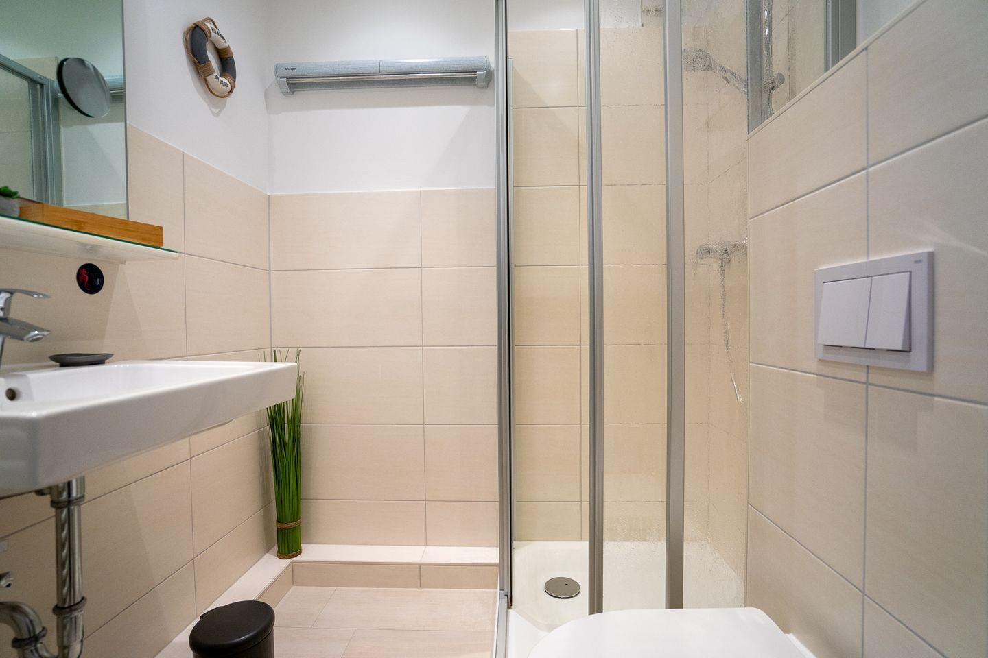 Durch diesen gelangen Sie in das Schlafzimmer, in das Wohnzimmer und in das Badezimmer. Das Badezimmer ist mit einer Dusche ausgestattet.