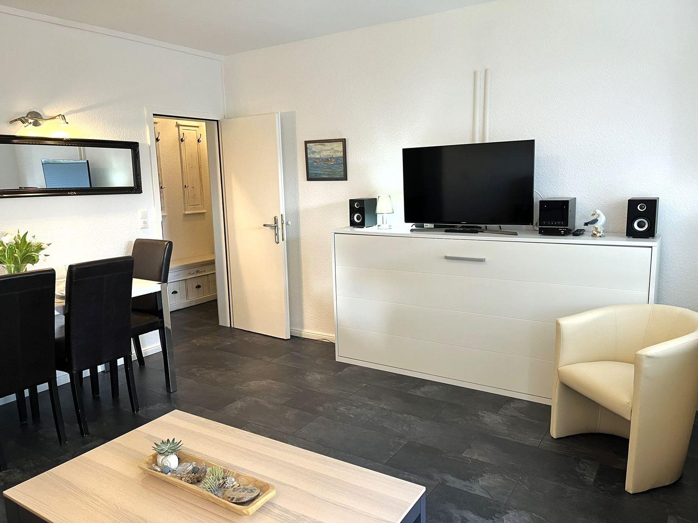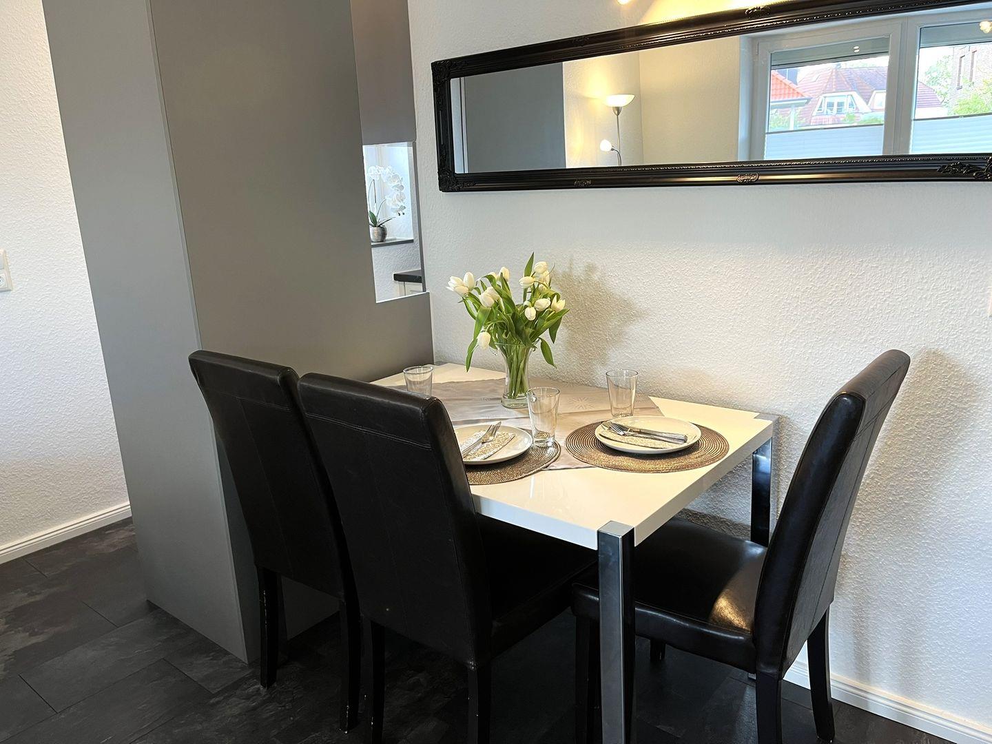 Im schicken Wohn- Essbereich erwartet Sie eine gemütliche, stilvolle Einrichtung. Auf der bequemen Couch können Sie entspannte Momente, bei einem Glas Wein, einem Film oder einfach nur so erleben.
