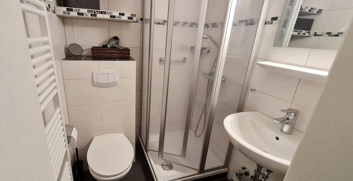 Das hübsche Badezimmer ist mit netten Accessoires und einem Handtuchwärmer genau so gemütlich, wie die ganze Wohnung.