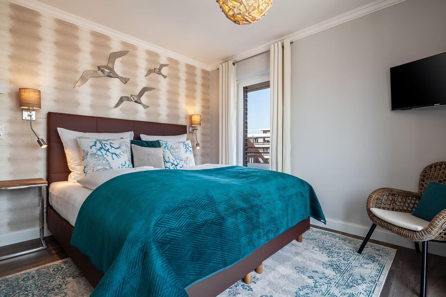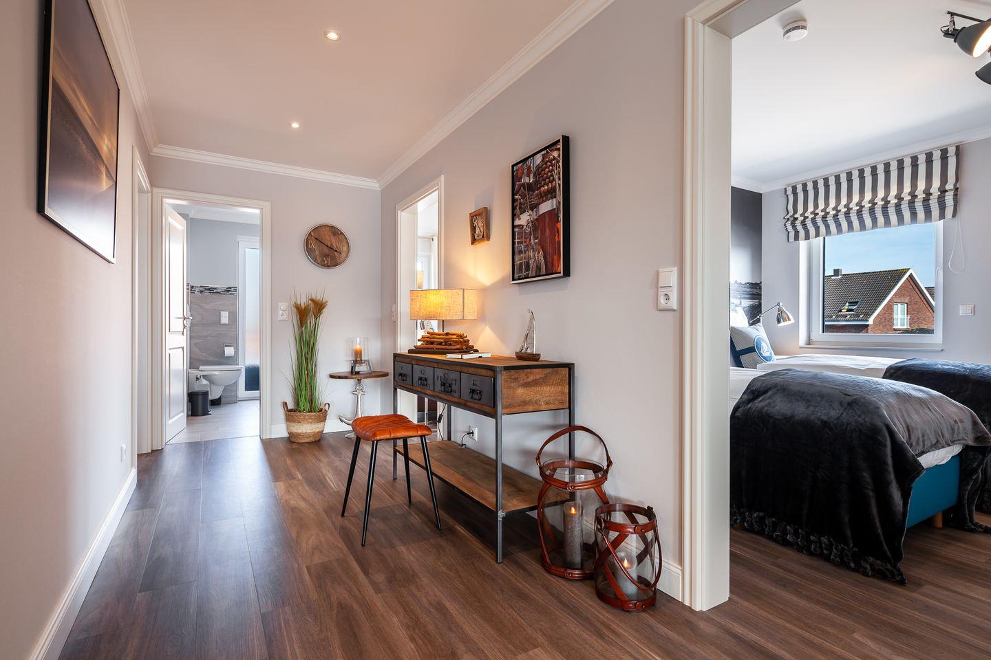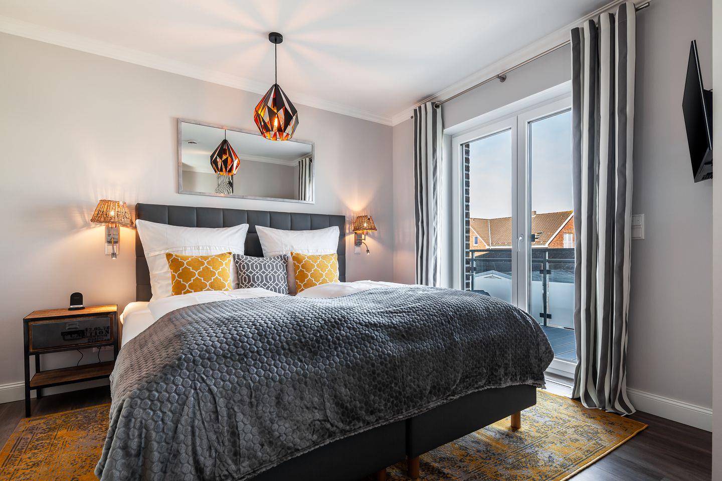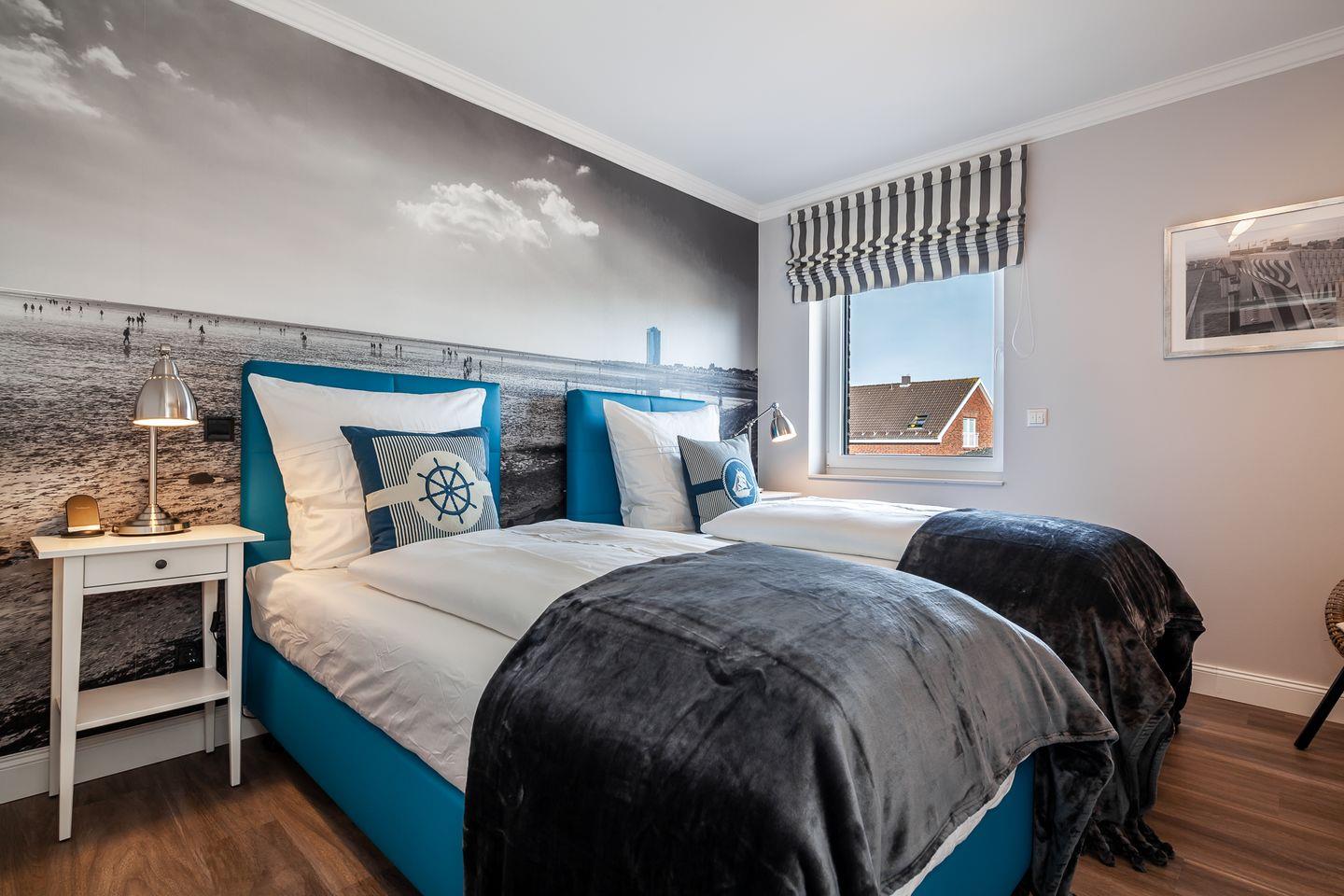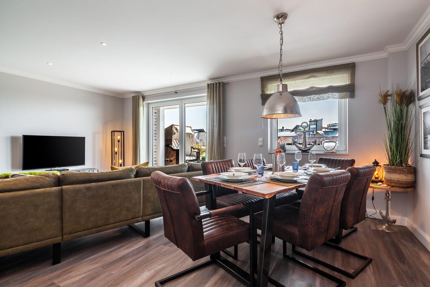 Sie ist nur wenige Minuten vom Hauptstrand entfernt. Auf dem großen Balkon nach S/W ist ein Strandkorb und ein Esstisch mit sechs Stühlen vorhanden, so dass von dort traumhafte Sonnenuntergänge genossen werden können. Die zwei weiteren Balkone ermöglichen die Sonnenstrahlen am Morgen zu genießen. Eine hochwertige Ausstattung mit stilsicherer Inneneinrichtung im "Industrie-/ Loft- Stil" und Liebe zum Detail zieht sich vom offenen Wohn-/ Ess- Küchenbereich über die drei Schlafzimmer bis zu den Bädern durch. Es gibt ein Duschbad und ein Bad mit Badewanne und Dusche- beide mit Fenstern. Zwei Schlafzimmer haben Boxspring- Doppelbetten (1,80m x2m, mit Einzelmatratzen) und ein Schlafzimmer zwei Boxspring- Einzelbetten, die aber auch zusammengeschoben/ verbunden werden können und so ebenfalls als Doppelbett genutzt werden können.