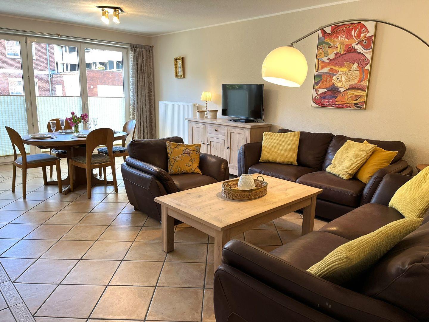 Von der Terrasse geht es direkt in den gemütlich eingerichteten Wohn- Essbereich, wo man es sich entweder auf der Couch gemütlich machen kann, oder sich an dem Esstisch mit Köstlichkeiten aus der Region, selbst ein bisschen verwöhnt.
