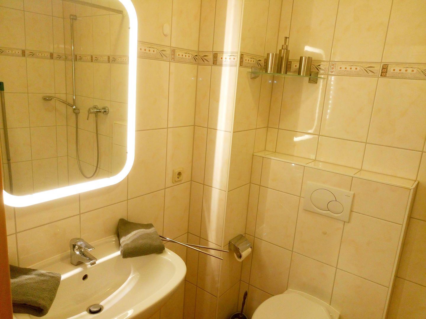 Ein Badezimmer mit Handtuchwärmer, Fußbodenheizung und einer bodengleichen Dusche macht diese Ferienwohnung perfekt, für einen entspannten Urlaub.
