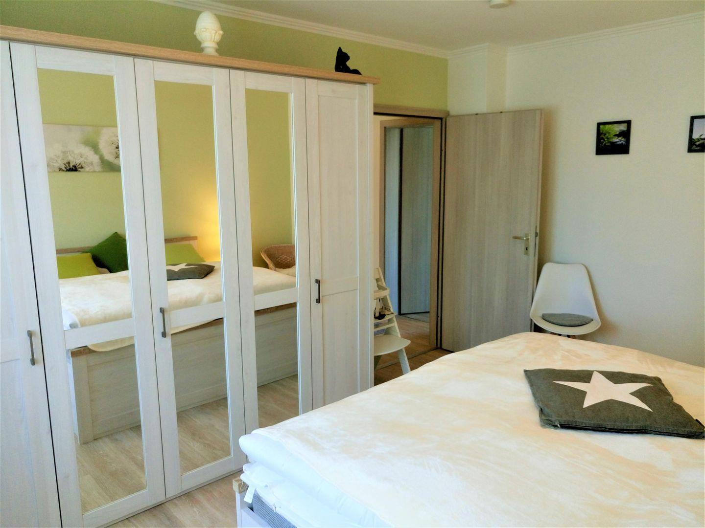 Mit einem Doppelbett (mit 2 Einzelmatratzen), einem Kleiderschrank ist das geräumige, stilvolle Schlafzimmer eingerichtet. Außenjalousien sorgen hier für einen geruhsamen Schlaf.