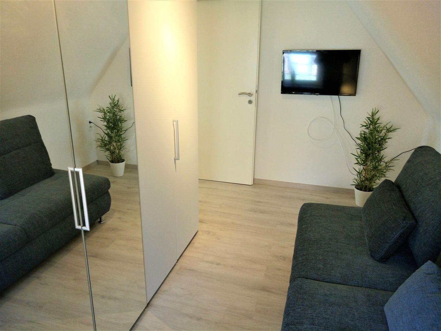 In der oberen Etage gibt es 2 weitere Schlafzimmer, eines mit einem bequemen Doppelbett ( 2 Einzelmatratzen), Smart-TV Gerät und Kleiderschrank möbliert in dem 2ten Schlafzimmer steht eine Schlafcouch, die auf 1,60m ausgezogen werden kann und 2 Personen Platz bietet. Von diesem Raum aus geht es in ein weiteres Bad mit Balkon, mit Waschbecken und Badewanne.,