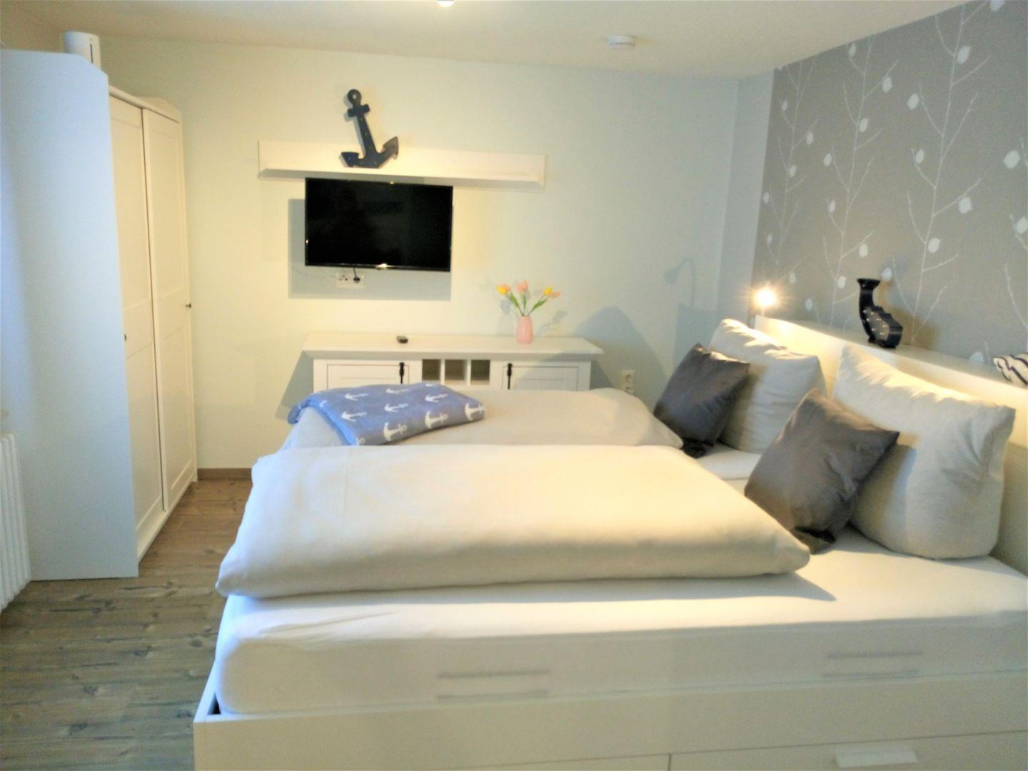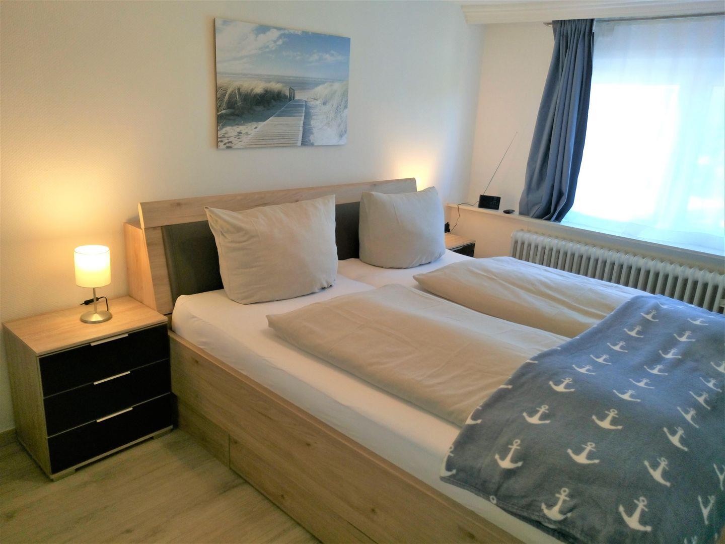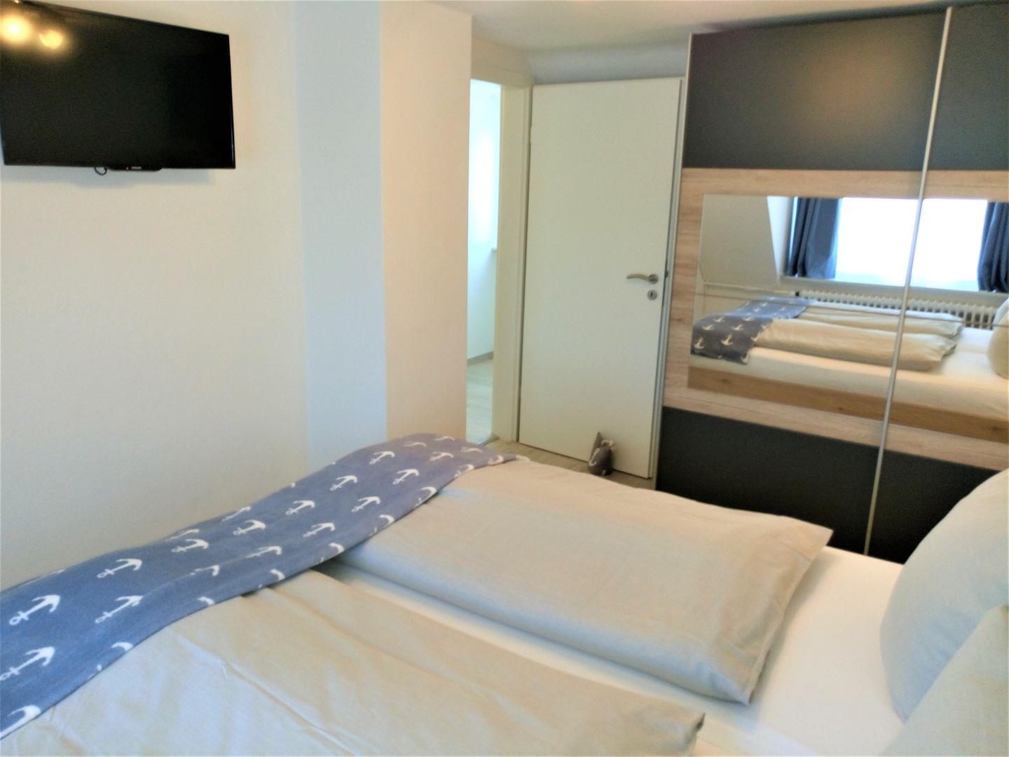 Eines der 3 Schlafzimmer befindet sich ebenso im Erdgeschoss, es ist mit einem hochwertigen Doppelbett (2 Einzelmatratzen), TV- Gerät und einem Kleiderschrank eingerichtet. Durch ein Tageslicht- Badezimmer mit einer ebenerdigen Dusche, Handtuchwärmer und Fußbodenheizung ist die untere Etage auch gut für Senioren oder Menschen mit leichten Einschränkungen nutzbar.