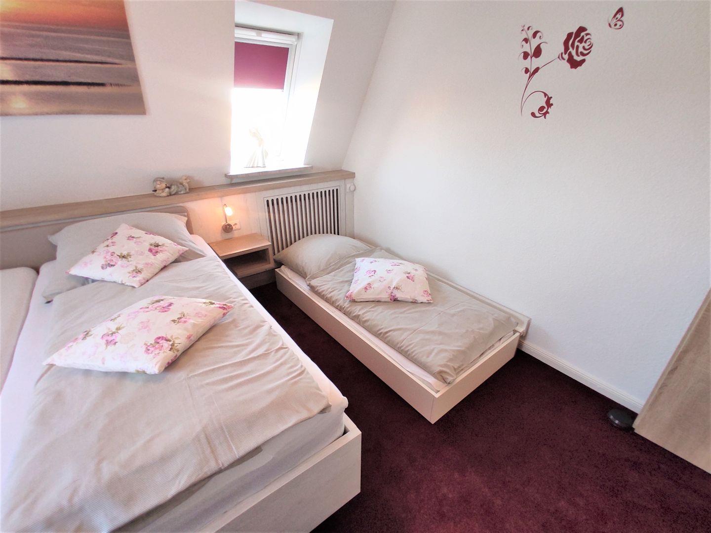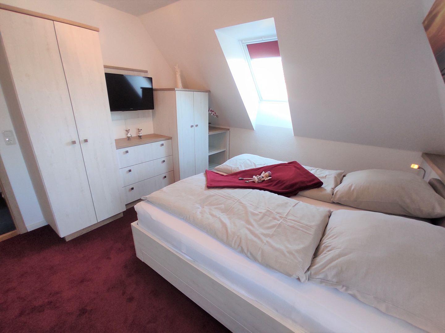 (2 Einzelmatratzen), einem Kleiderschrank und einem TV- Gerät möbliert. Für Kinder bis 12 Jahren kann man noch ein zusätzliches Bett herausfahren, so dass insgesamt 3 Schlafmöglichkeiten bereit stehen. Der Raum kann für einen guten Schlaf mit Veluxrollo verdunkelt werden.