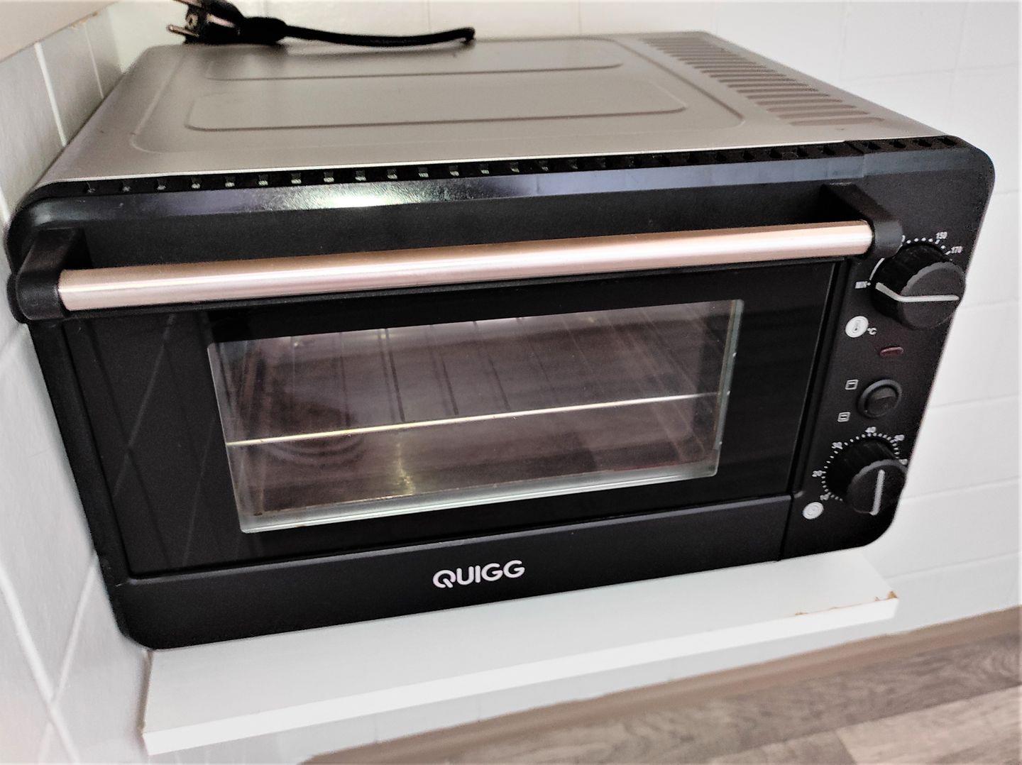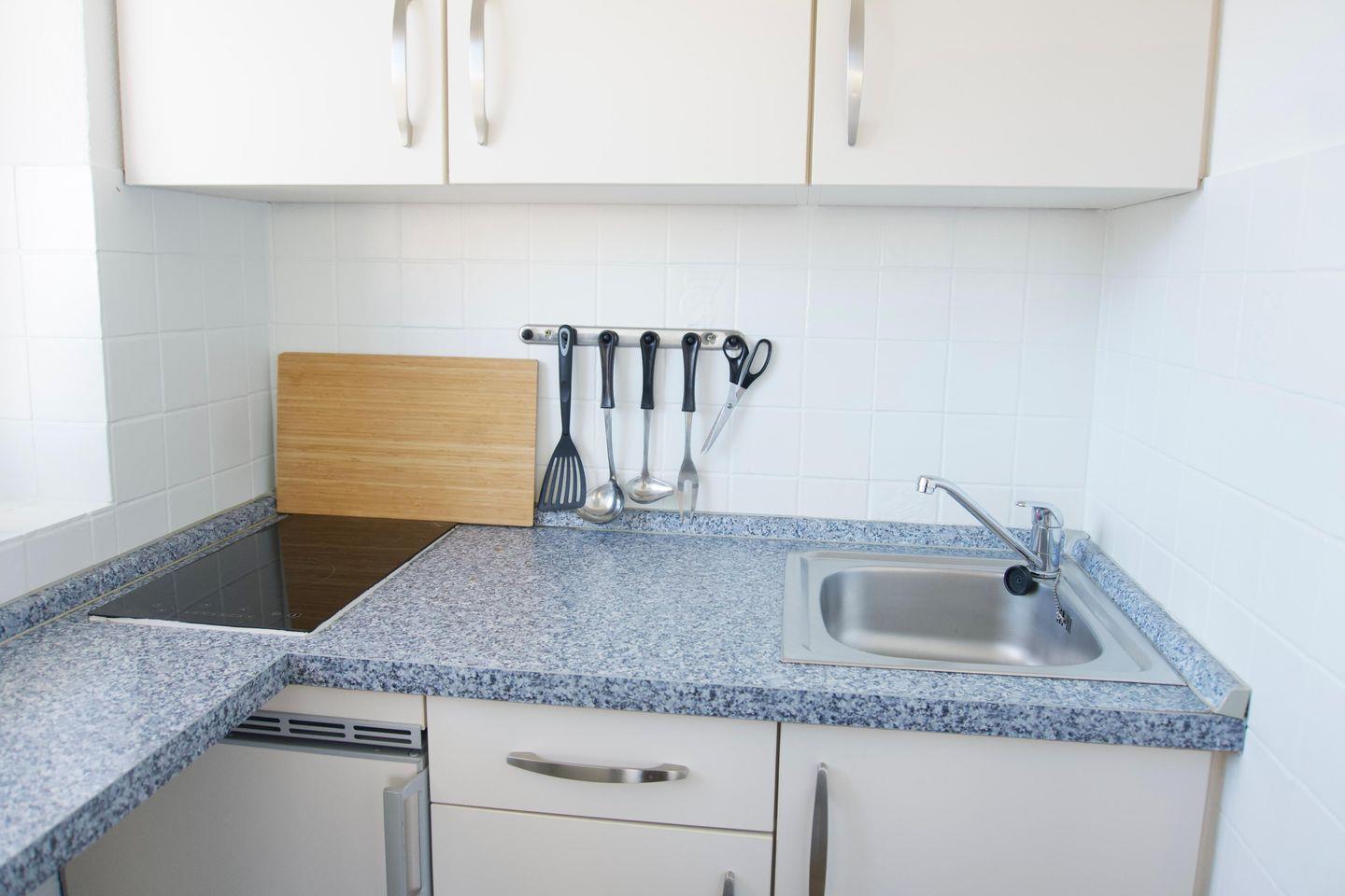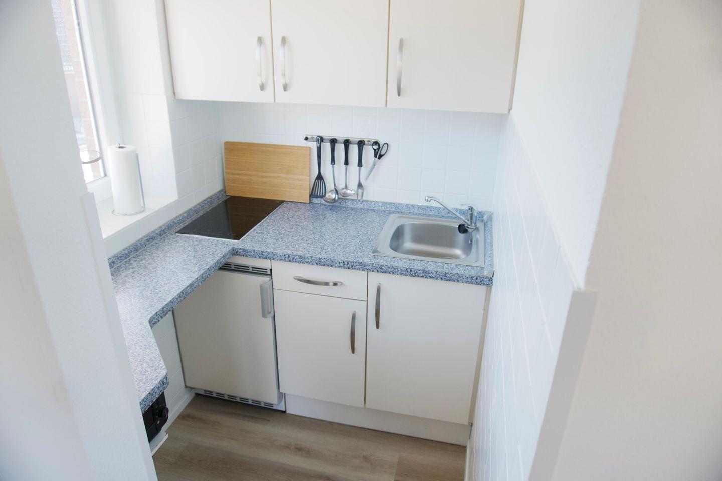 Die Küchenzeile ist mit einem Zwei- Platten- Ceranfeld, einem Kühlschrank mit kleinem Gefrierfach, einem Minibackofen und natürlich mit Geschirr und Kochutensilien ausgestattet.