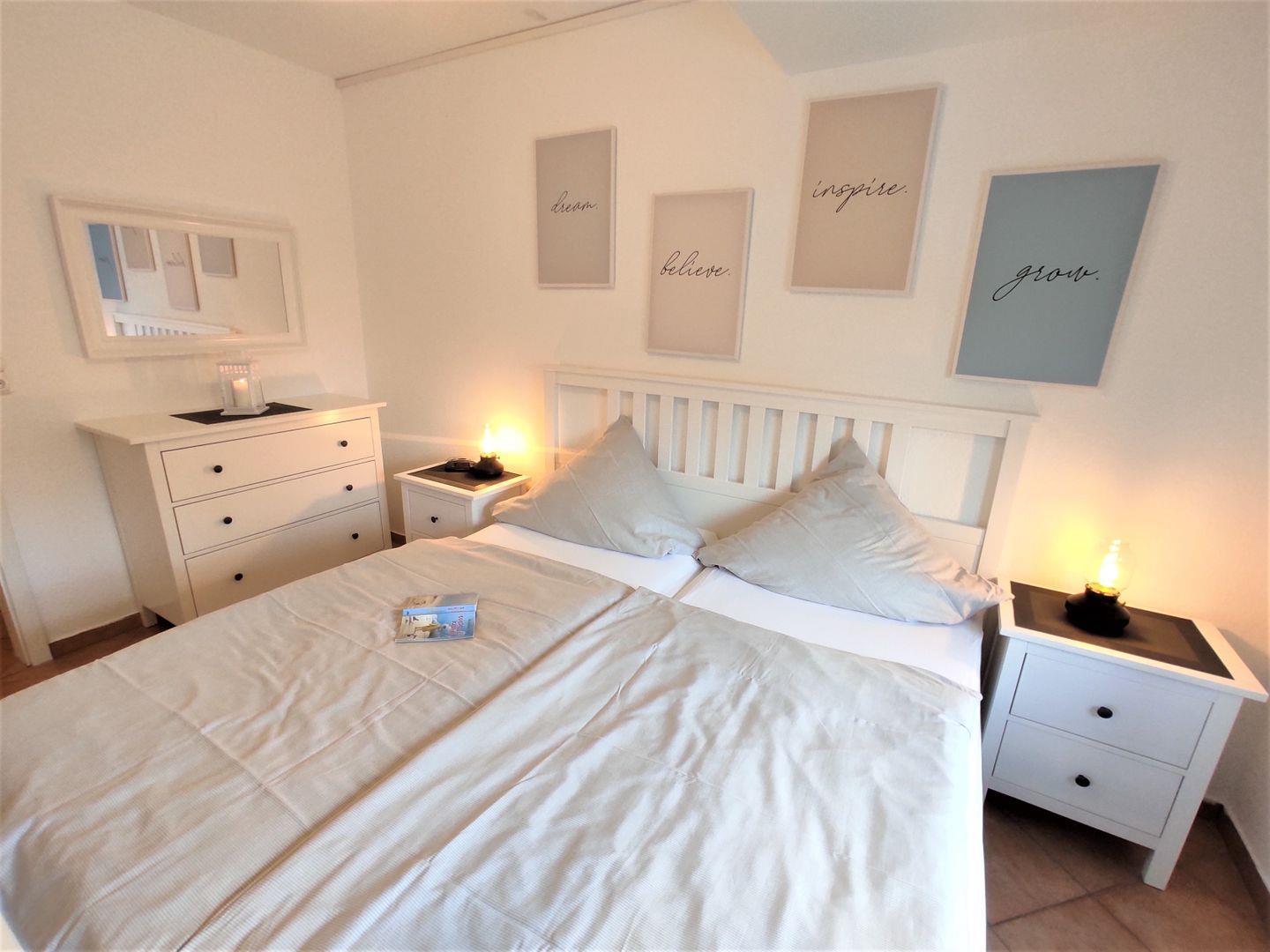 Das separate Schlafzimmer verfügt über ein Doppelbett (1,80x 2m mit 2 Einzelmatratzen) und eine Kleiderkommode, es garantiert einen erholsamen Schlaf, in dieser ruhigen Lage.
