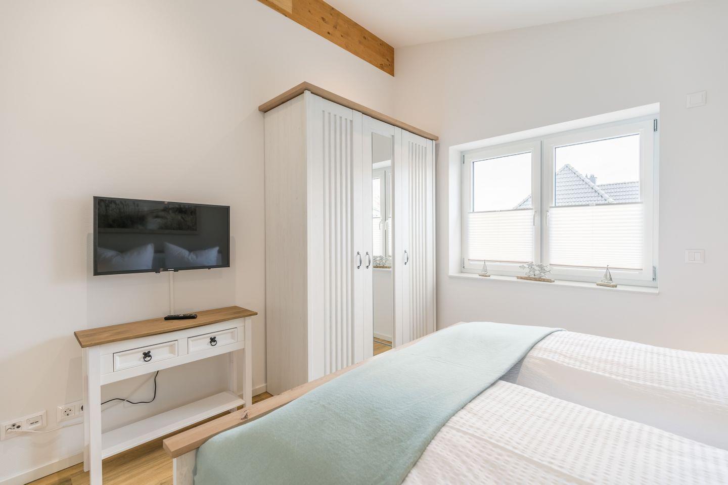 Bett 200 x 140 x 60 cm (durchgehende Matratze), Kleiderschrank, Ganzkörperspiegel, Kommode, Flachbild-TV, Fenster mit Plissee und elektrischen Außenrollos