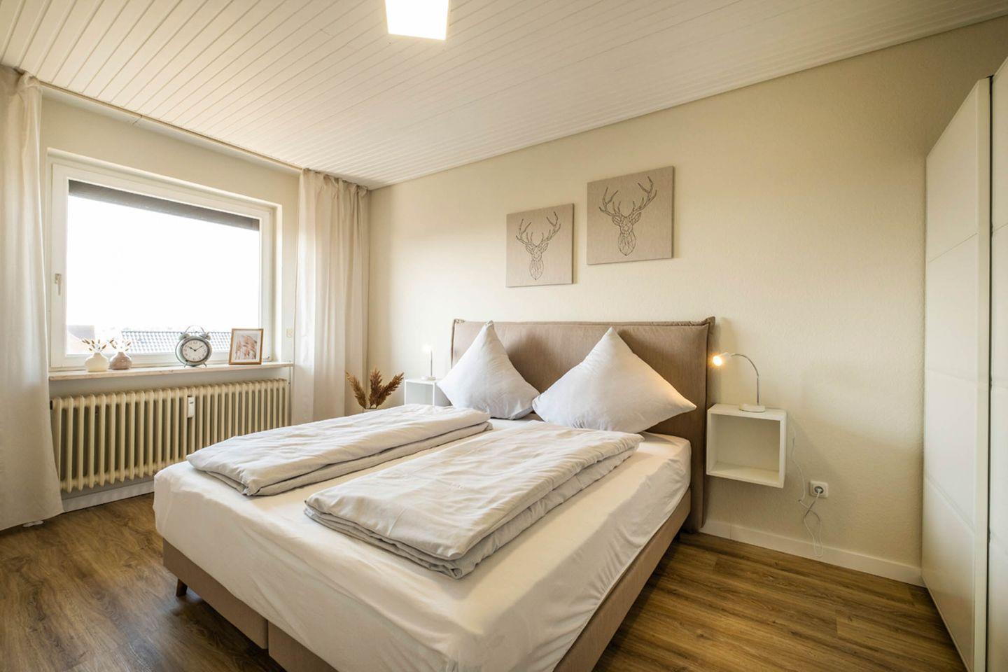 Die helle, freundliche Ferienwohnung verfügt über ein Schlafzimmer, ein geräumiges Wohnzimmer mit integriertem Essbereich und einer Küche. selbstverständlich gehört auch ein Duschbad zur Ferienwohnung. Hier ist die Dusche ist mit einem Haltegriff versehen. Die Wohnung verfügt über elektrische Außenjalousien. Der Wohn- und Schlafraum wurde Anfang des Jahres 2023 modernisiert und mit neuen Möbeln ausgestattet.