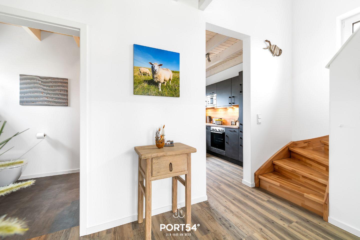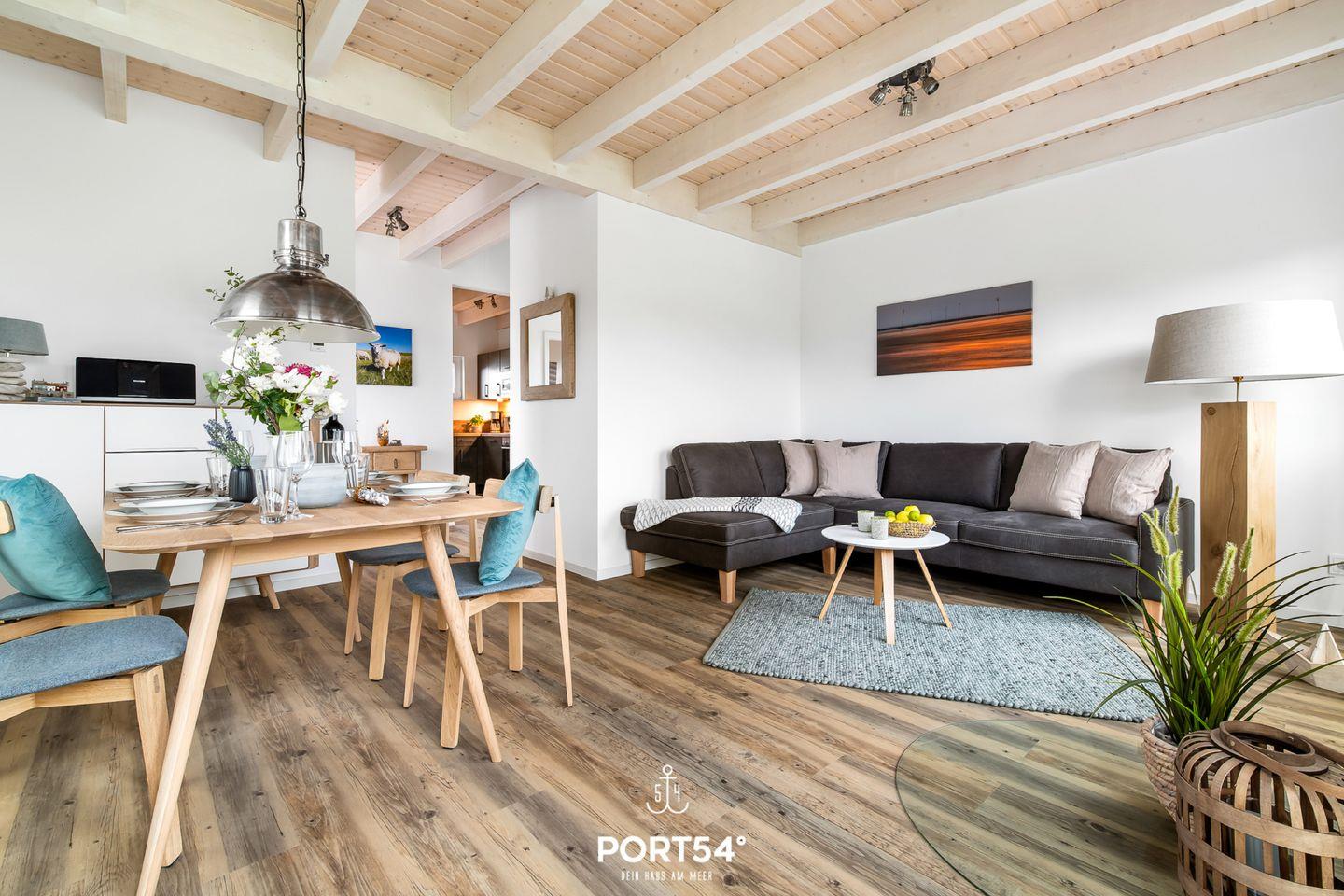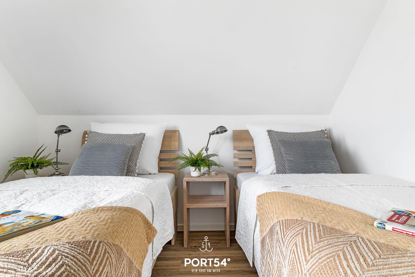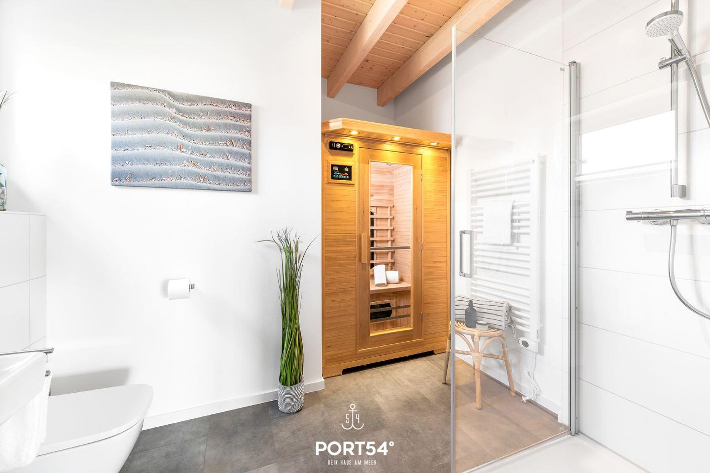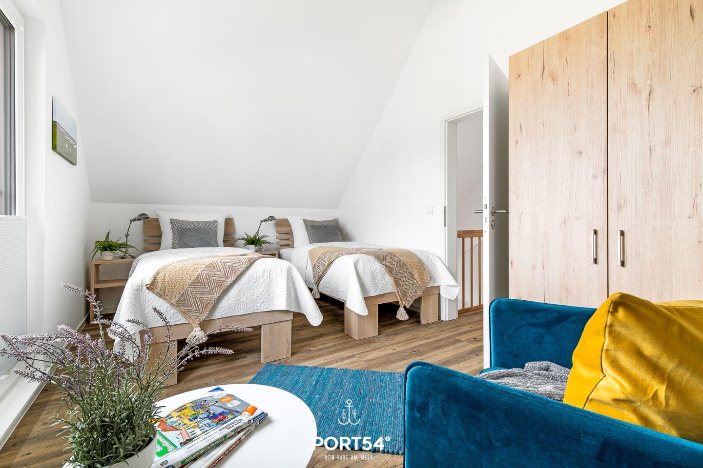 Schlafzimmer finden Sie im Obergeschoss. Eines der Schlafzimmer ist mit einem Doppelbett (180x200cm), das andere mit zwei Einzelbetten (je 90x200cm) ausgestattet und in beiden finden Sie Flachbild-TV's. Im Haus stehen zwei Badezimmer für Sie bereit. Eines der Badezimmer bietet eine Dusche, sowie eine Infrarot-Sauna. Das andere ist ein Vollbad mit Badewanne. Die schöne Süd-Terrasse lädt mit ihren gemütlichen Gartenmöbeln zum Verweilen ein. Ein Grill steht für einen gemütliches Abendessen unter freiem Himmel zur Verfügung. Ihre mitgebrachten oder ausgeliehenen Fahrräder, sowie einen Kinderwagen, können Sie im abschließbaren Fahrradschuppen direkt vor dem Haus unterstellen. Ein kostenfreier eigener Parkplatz steht Ihnen vor der Unterkunft zur Verfügung. Sollten Sie Ihren Nordseeurlaub mit der ganzen Familie und Freunden verbringen wollen, können wir Ihnen durch die Verwaltung mehrerer Objekte auch eine Symbiose aus 2 nebeneinander liegenden Ferienwohnungen ermöglichen.