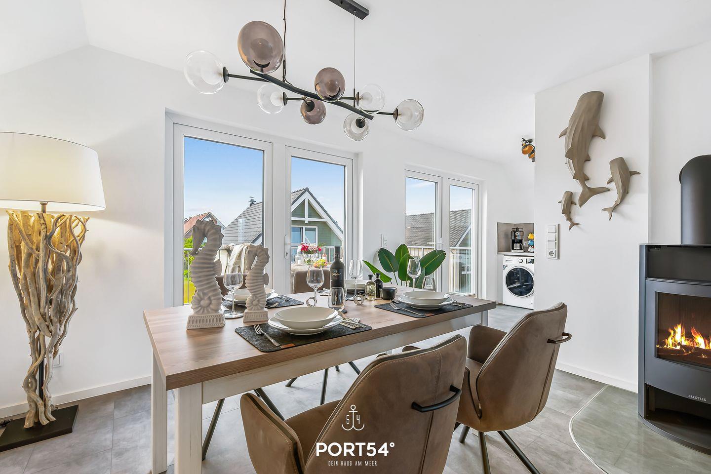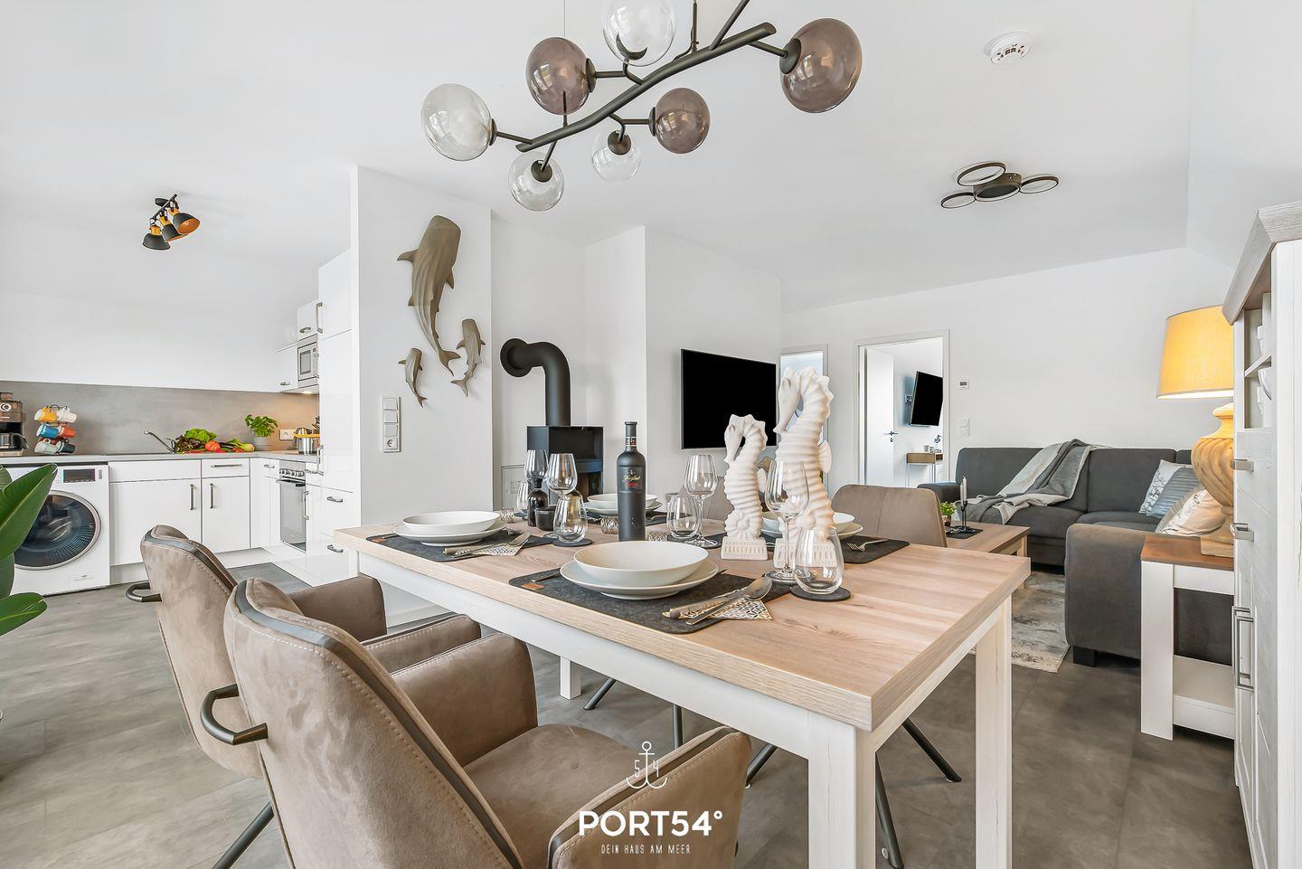 Der helle, lichtdurchflutete Wohnbereich lädt mit gemütlichem Kamin und Flachbild-TV mit MAGENTA zu entspannten Abenden ein. In der offenen, voll ausgestatteten Küche mit Geschirrspüler, Backofen und vielem mehr können Sie gemeinsam kochen und anschließend am Esstisch für bis zu vier Personen genießen. Ein Hochstuhl für kleine Gäste steht ebenfalls bereit.