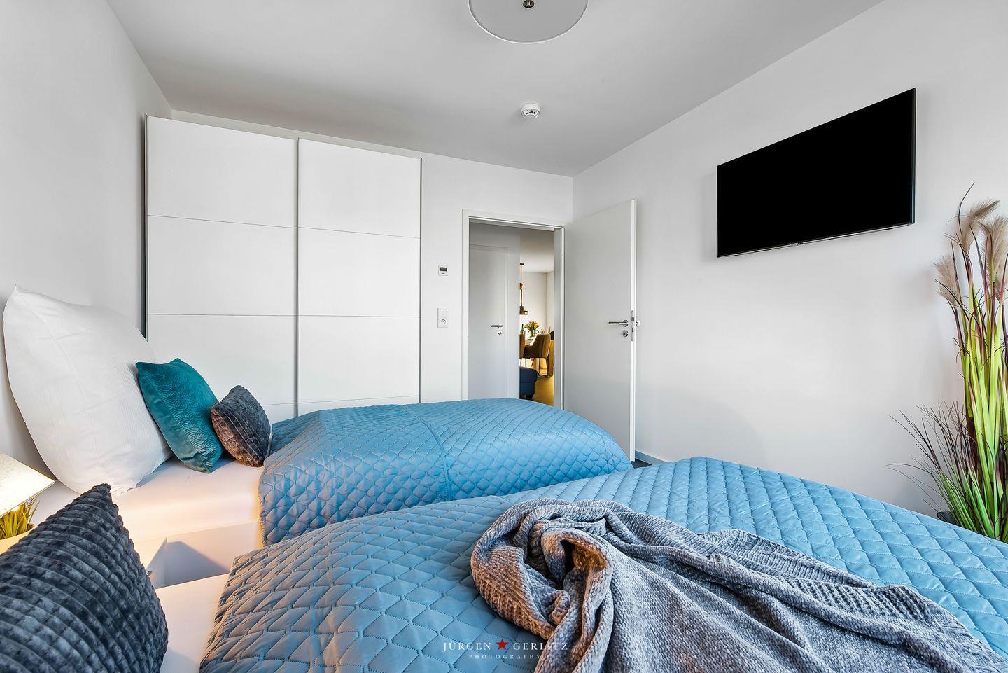 Die beiden Schlafzimmer sind liebevoll eingerichtet und bieten erholsame Rückzugsorte. Ein Schlafzimmer verfügt über ein komfortables Doppelbett, das zweite über zwei Einzelbetten, die bei Bedarf zusammengeschoben werden können. In beiden Zimmern steht Ihnen jeweils ein TV zur Verfügung – perfekt für entspannte Auszeiten.