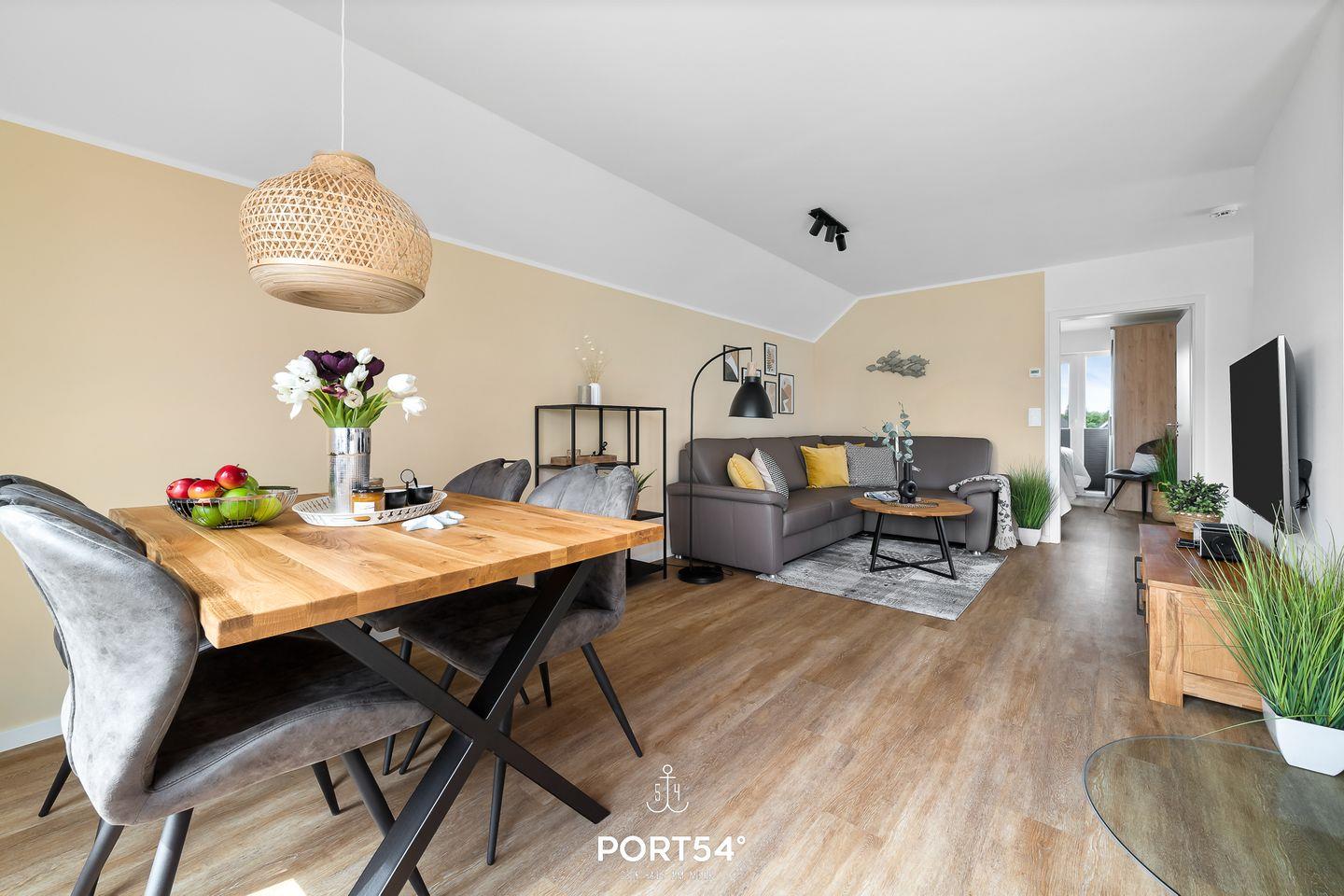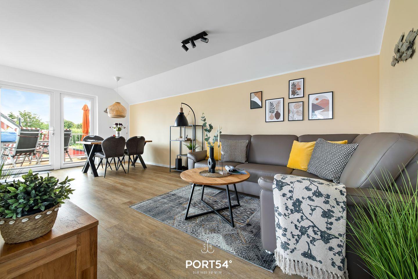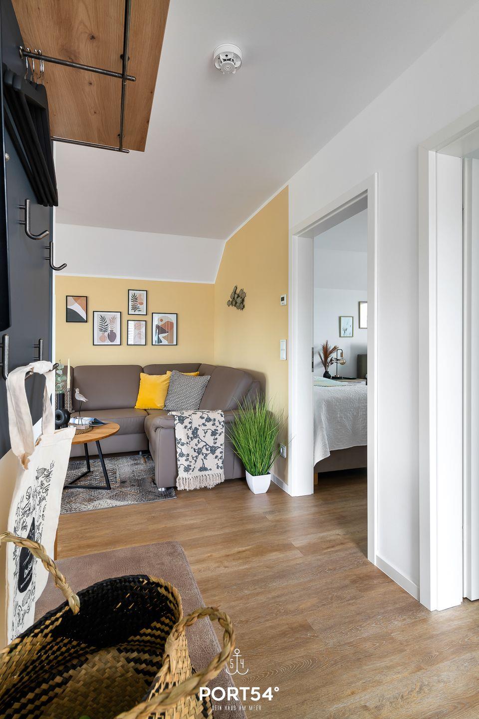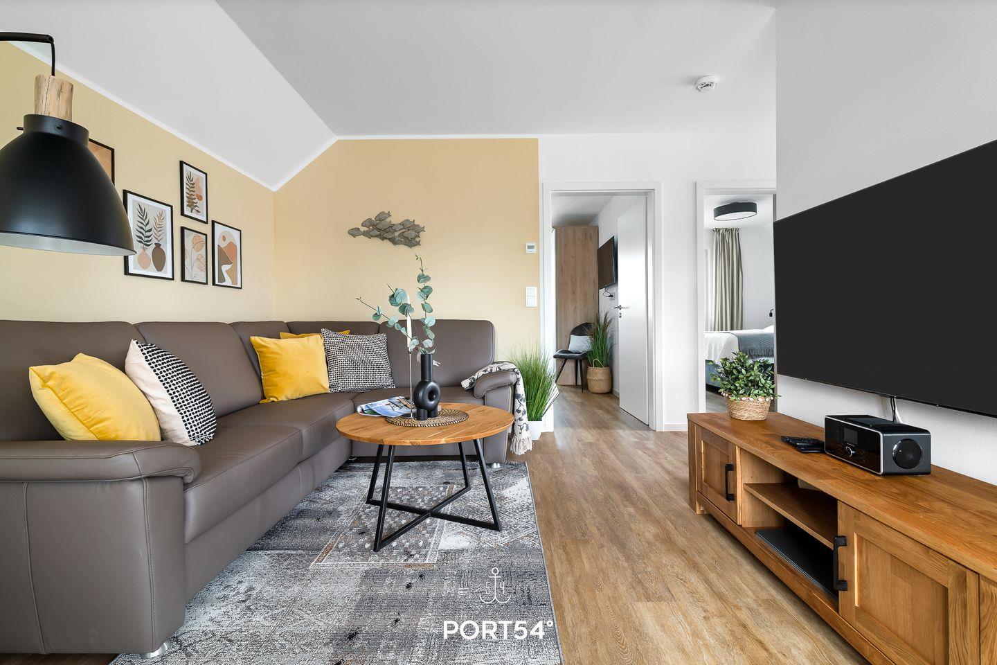 Der gemütliche und moderne Wohnbereich bietet ein Ecksofa mit Querschläferfunktion für