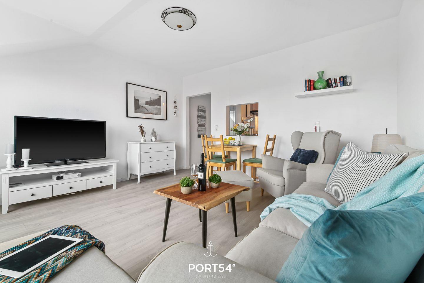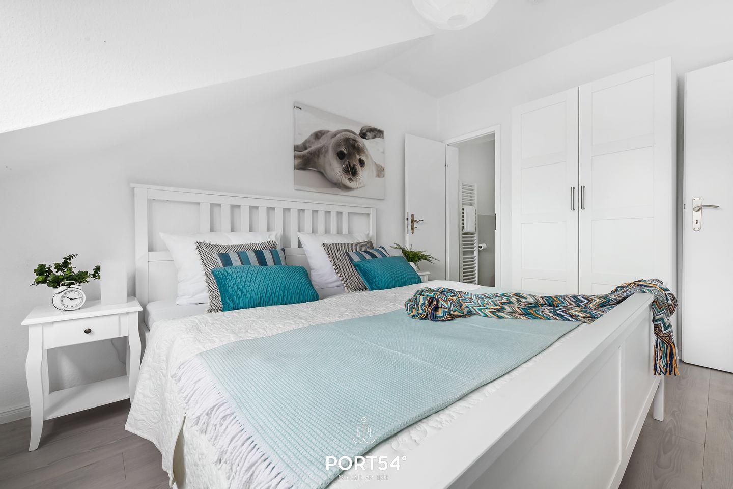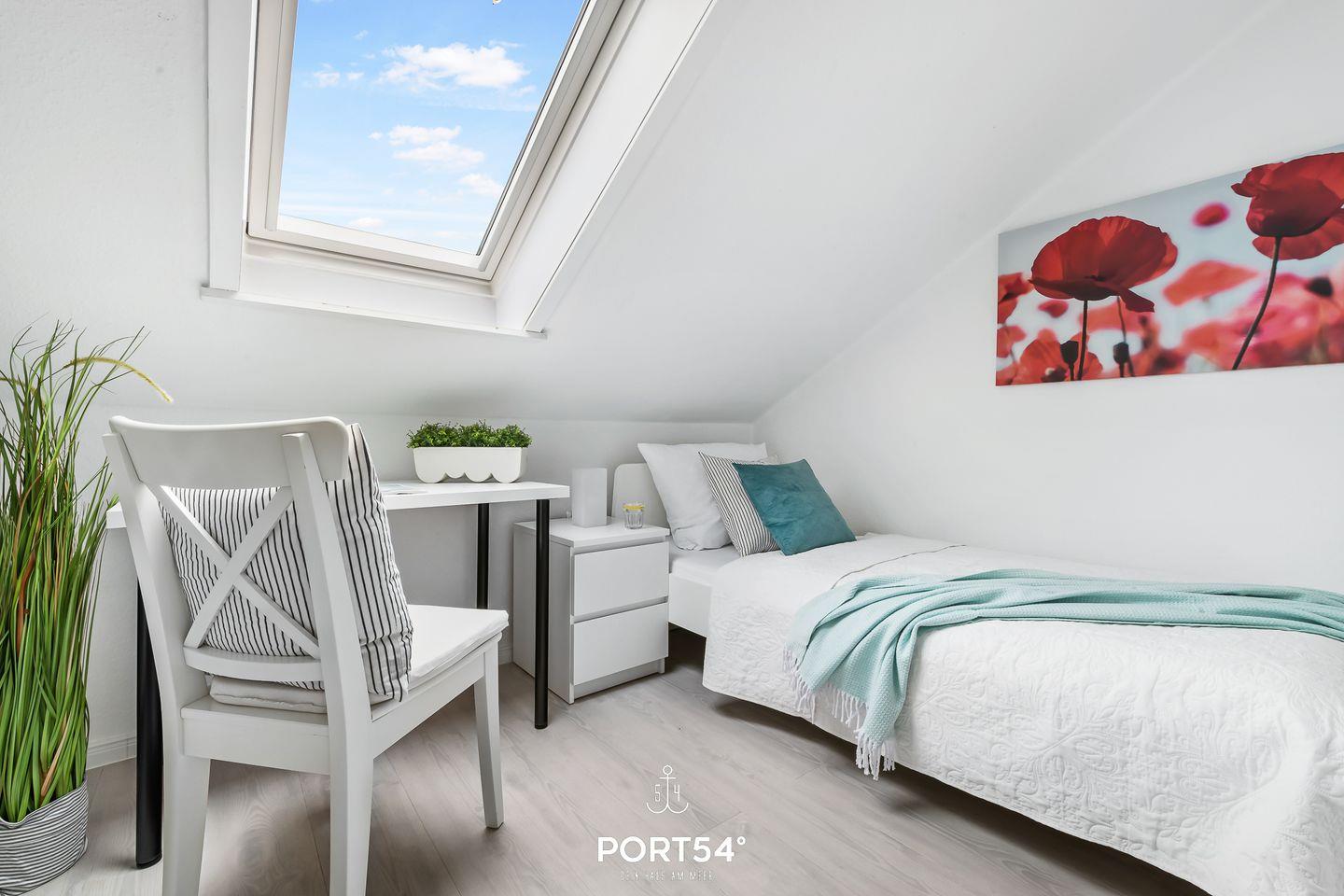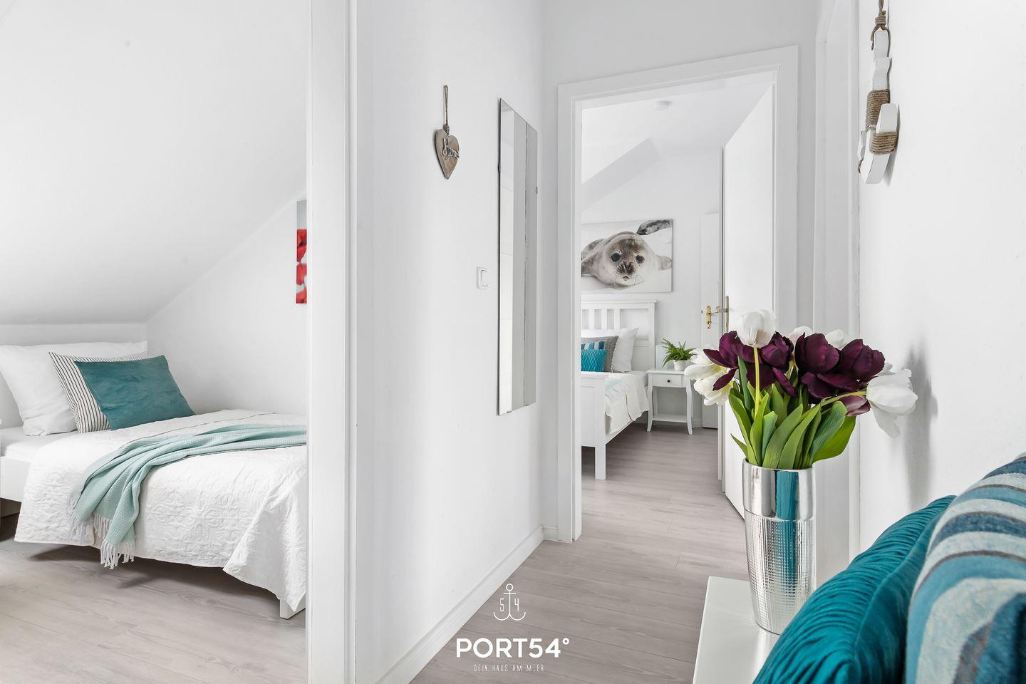 Für bis zu 3 Personen bietet die im 2. Obergeschoss gelegene Wohnung "Deck 7" zwei gemütliche Schlafzimmer, ein geräumiges Wohnzimmer mit angrenzendem Essbereich und offener Küche, sowie ein Duschbad en Suite. Im ersten Schlafzimmer erwartet Sie ein großes Doppelbett (180x200cm) sowie der Zugang zum Duschbad. Bitte beachten Sie, dass das Bad nur durch dieses Schlafzimmer zu erreichen ist. Das zweite Schlafzimmer ist mit einem Einzelbett (90x200cm) ausgestattet. Für eine erholsame Nachtruhe ist das Schlafzimmer mit Verdunkelungsmöglichkeiten ausgestattet. Für die kleinsten Gäste steht ein Hochstuhl sowie ein Reisebett zur Verfügung. Zur Wohnung gehört ein kleiner Balkon mit Tisch und Stühlen. Parkplätze sind für alle Wohnungen am Haus vorhanden. Zusammen mit den anderen Wohnungen können Sie im Fahrradschuppen Ihre mitgebrachten oder vor Ort geliehenen Fahrräder unterstellen. Außerdem befindet sich im gemeinschaftlich genutzten Waschraum eine Waschmaschine und ein Trockner, diese sind gegen eine kleine Gebühr nutzbar. Hinter dem Haus befindet sich eine private Parkfläche, auf welcher Sie Ihren PKW abstellen können.