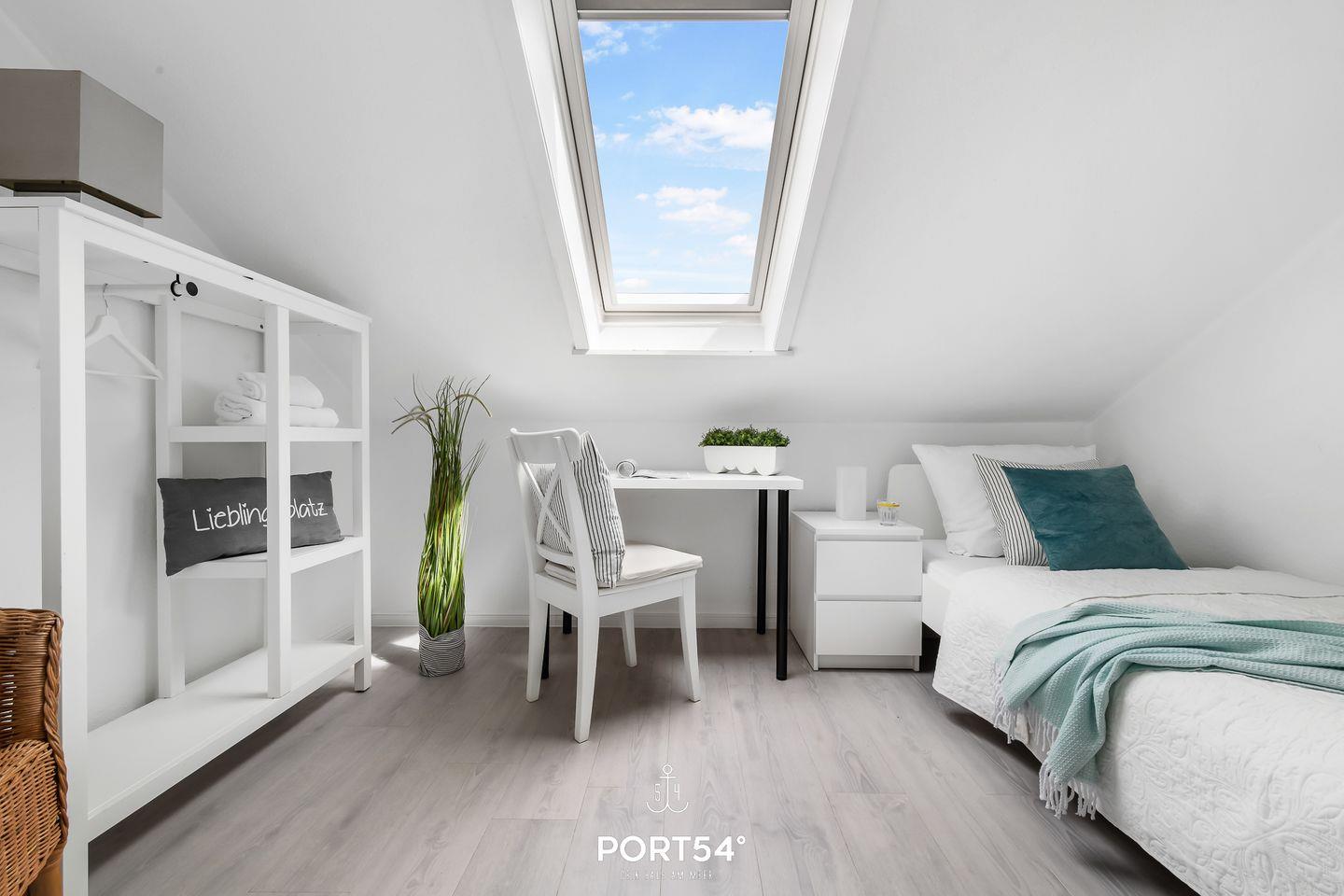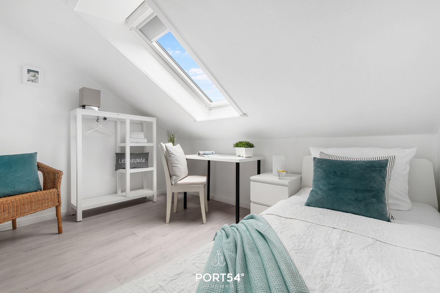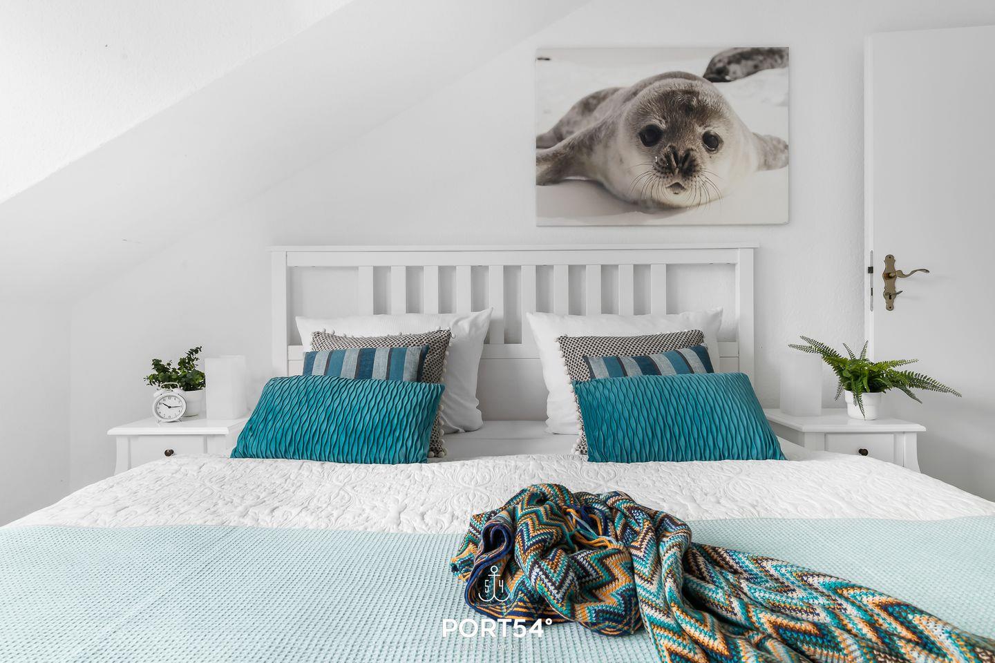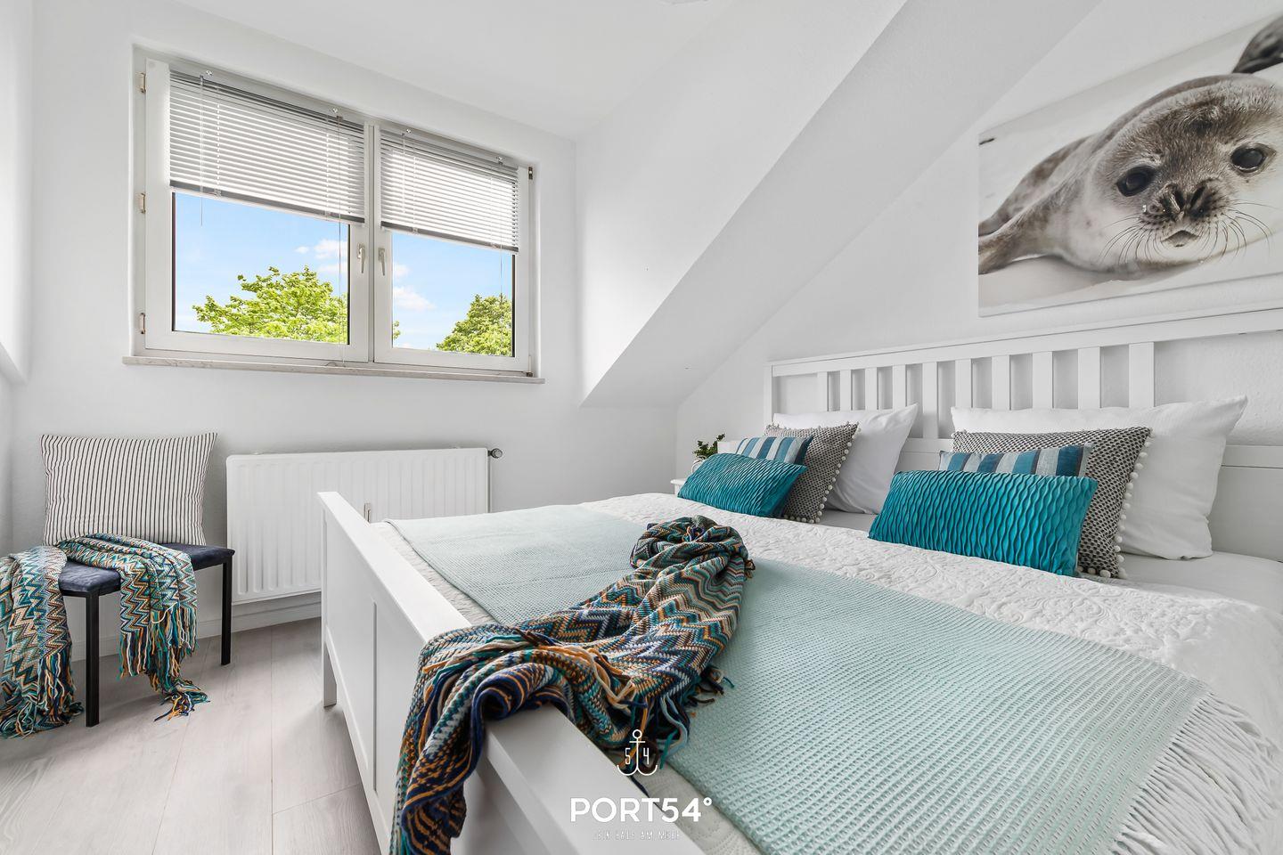 Für bis zu 3 Personen bietet die im 2. Obergeschoss gelegene Wohnung "Deck 7" zwei gemütliche Schlafzimmer, ein geräumiges Wohnzimmer mit angrenzendem Essbereich und offener Küche, sowie ein Duschbad en Suite. Im ersten Schlafzimmer erwartet Sie ein großes Doppelbett (180x200cm) sowie der Zugang zum Duschbad. Bitte beachten Sie, dass das Bad nur durch dieses Schlafzimmer zu erreichen ist. Das zweite Schlafzimmer ist mit einem Einzelbett (90x200cm) ausgestattet. Für eine erholsame Nachtruhe ist das Schlafzimmer mit Verdunkelungsmöglichkeiten ausgestattet. Für die kleinsten Gäste steht ein Hochstuhl sowie ein Reisebett zur Verfügung. Zur Wohnung gehört ein kleiner Balkon mit Tisch und Stühlen. Parkplätze sind für alle Wohnungen am Haus vorhanden. Zusammen mit den anderen Wohnungen können Sie im Fahrradschuppen Ihre mitgebrachten oder vor Ort geliehenen Fahrräder unterstellen. Außerdem befindet sich im gemeinschaftlich genutzten Waschraum eine Waschmaschine und ein Trockner, diese sind gegen eine kleine Gebühr nutzbar. Hinter dem Haus befindet sich eine private Parkfläche, auf welcher Sie Ihren PKW abstellen können.