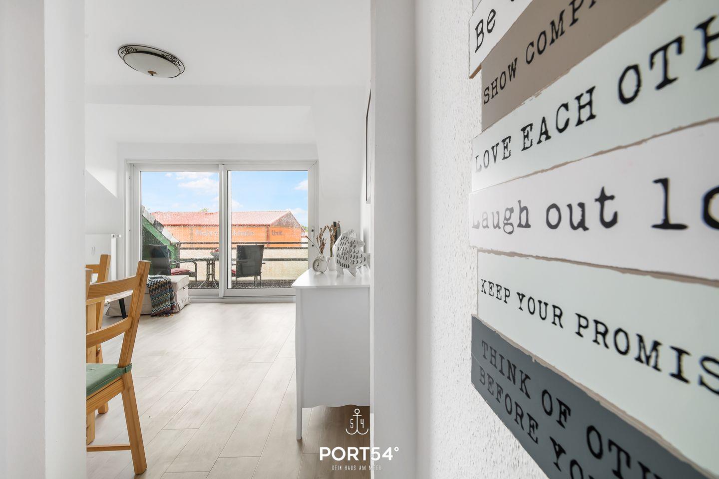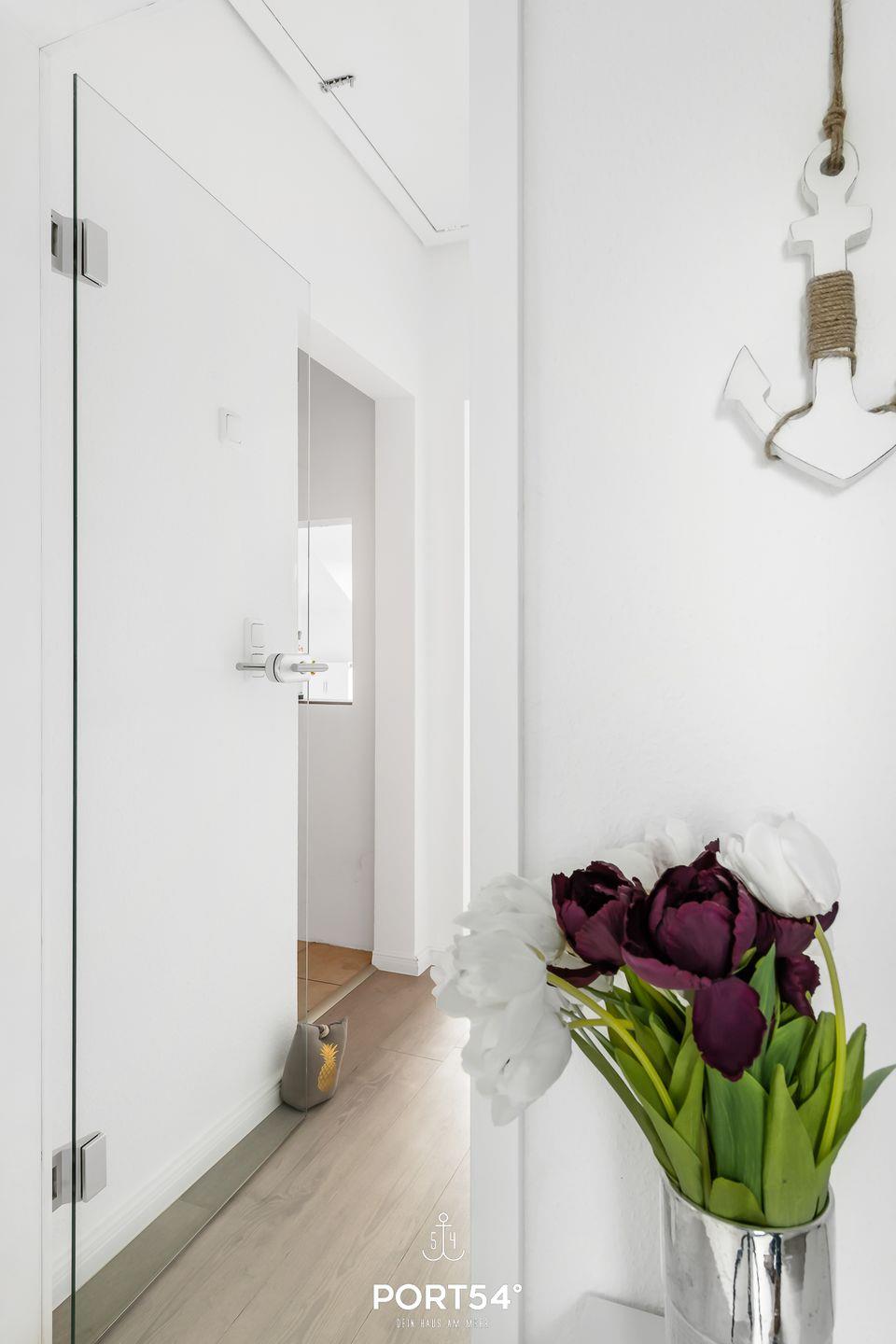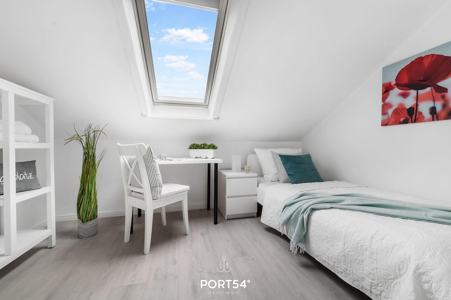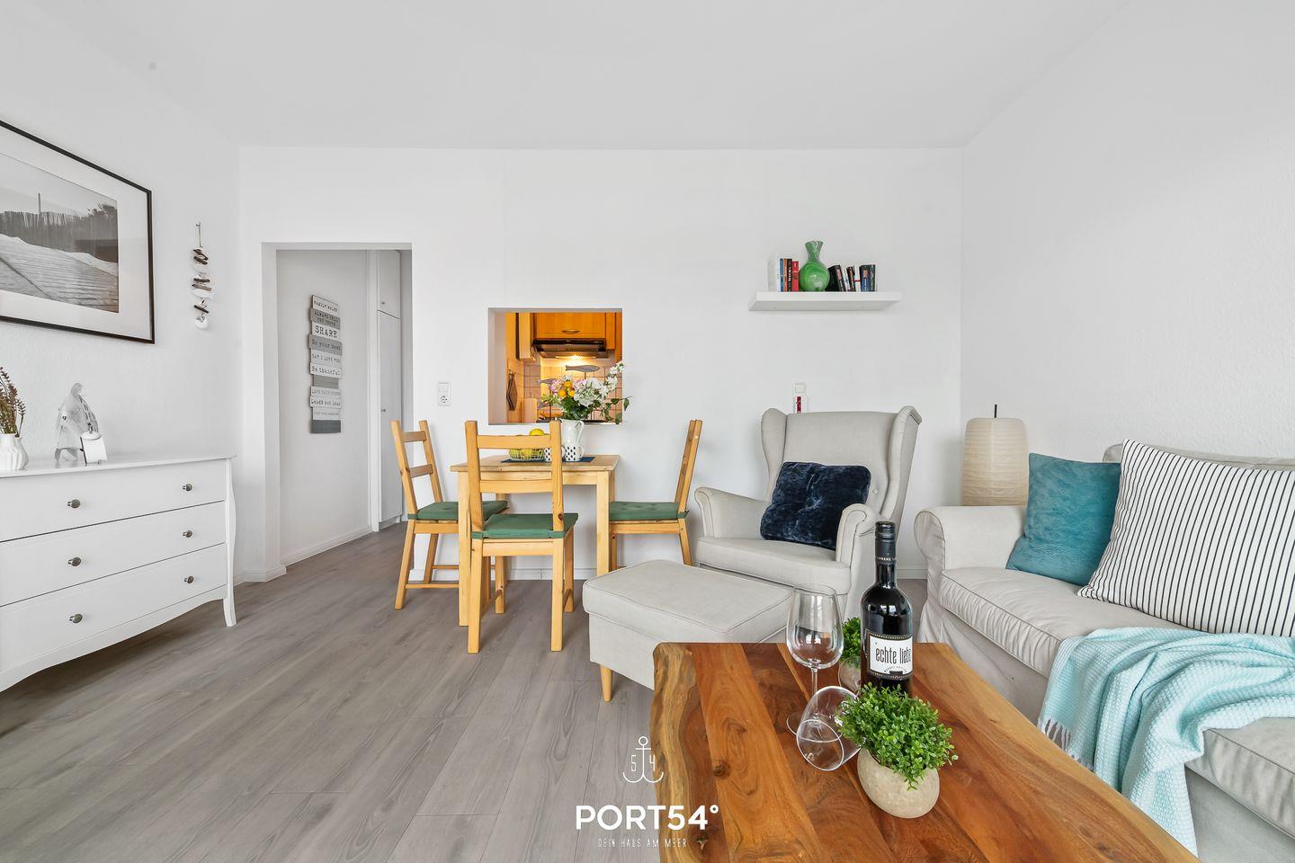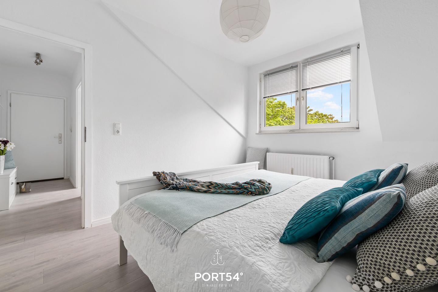 Für bis zu 3 Personen bietet die im 2. Obergeschoss gelegene Wohnung "Deck 7" zwei gemütliche Schlafzimmer, ein geräumiges Wohnzimmer mit angrenzendem Essbereich und offener Küche, sowie ein Duschbad en Suite. Im ersten Schlafzimmer erwartet Sie ein großes Doppelbett (180x200cm) sowie der Zugang zum Duschbad. Bitte beachten Sie, dass das Bad nur durch dieses Schlafzimmer zu erreichen ist. Das zweite Schlafzimmer ist mit einem Einzelbett (90x200cm) ausgestattet. Für eine erholsame Nachtruhe ist das Schlafzimmer mit Verdunkelungsmöglichkeiten ausgestattet. Für die kleinsten Gäste steht ein Hochstuhl sowie ein Reisebett zur Verfügung. Zur Wohnung gehört ein kleiner Balkon mit Tisch und Stühlen. Parkplätze sind für alle Wohnungen am Haus vorhanden. Zusammen mit den anderen Wohnungen können Sie im Fahrradschuppen Ihre mitgebrachten oder vor Ort geliehenen Fahrräder unterstellen. Außerdem befindet sich im gemeinschaftlich genutzten Waschraum eine Waschmaschine und ein Trockner, diese sind gegen eine kleine Gebühr nutzbar. Hinter dem Haus befindet sich eine private Parkfläche, auf welcher Sie Ihren PKW abstellen können.
