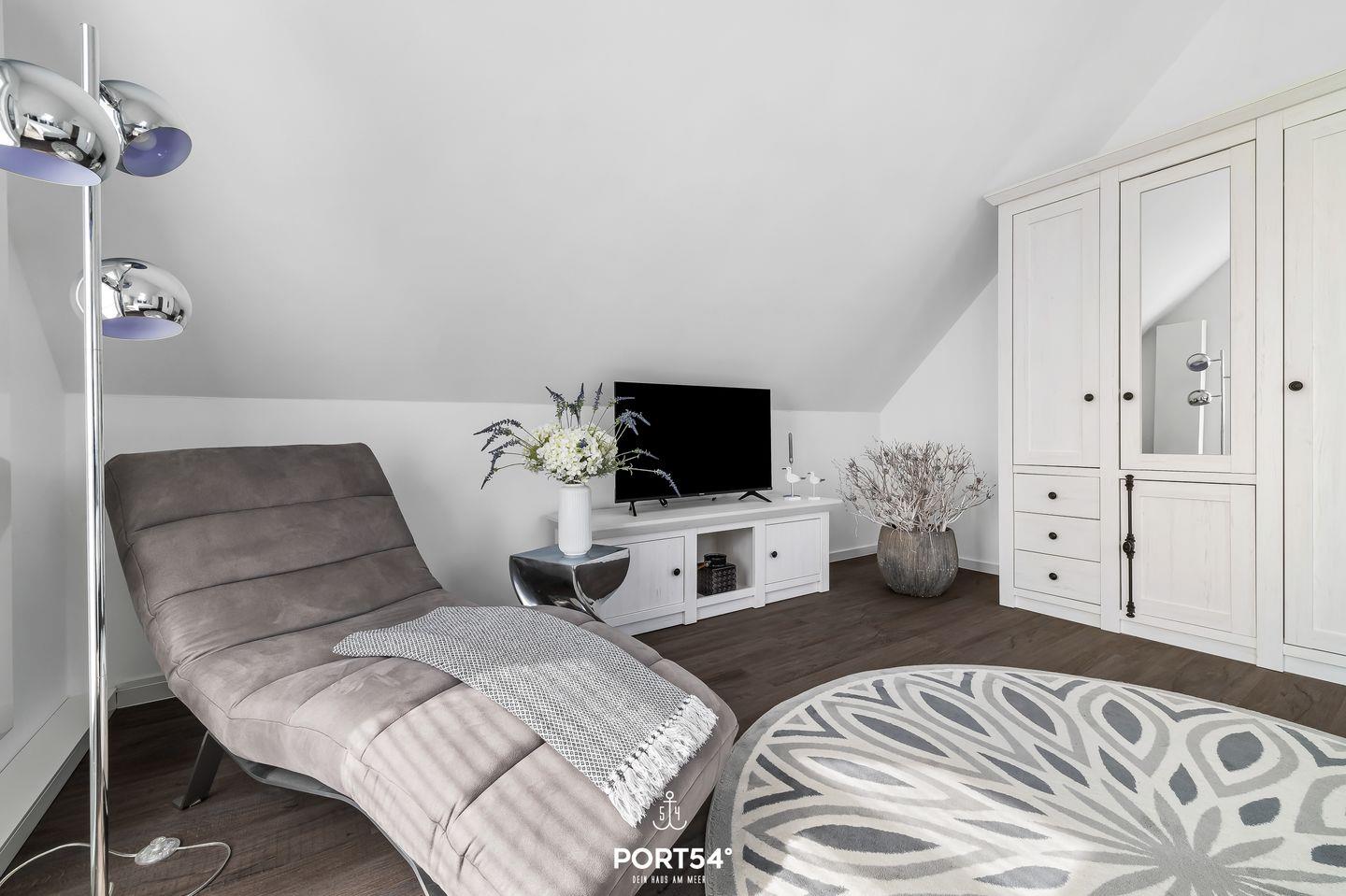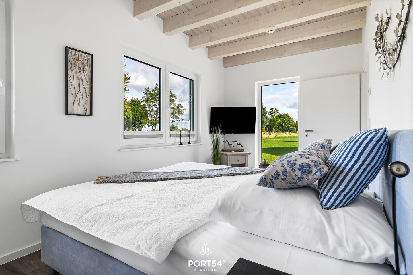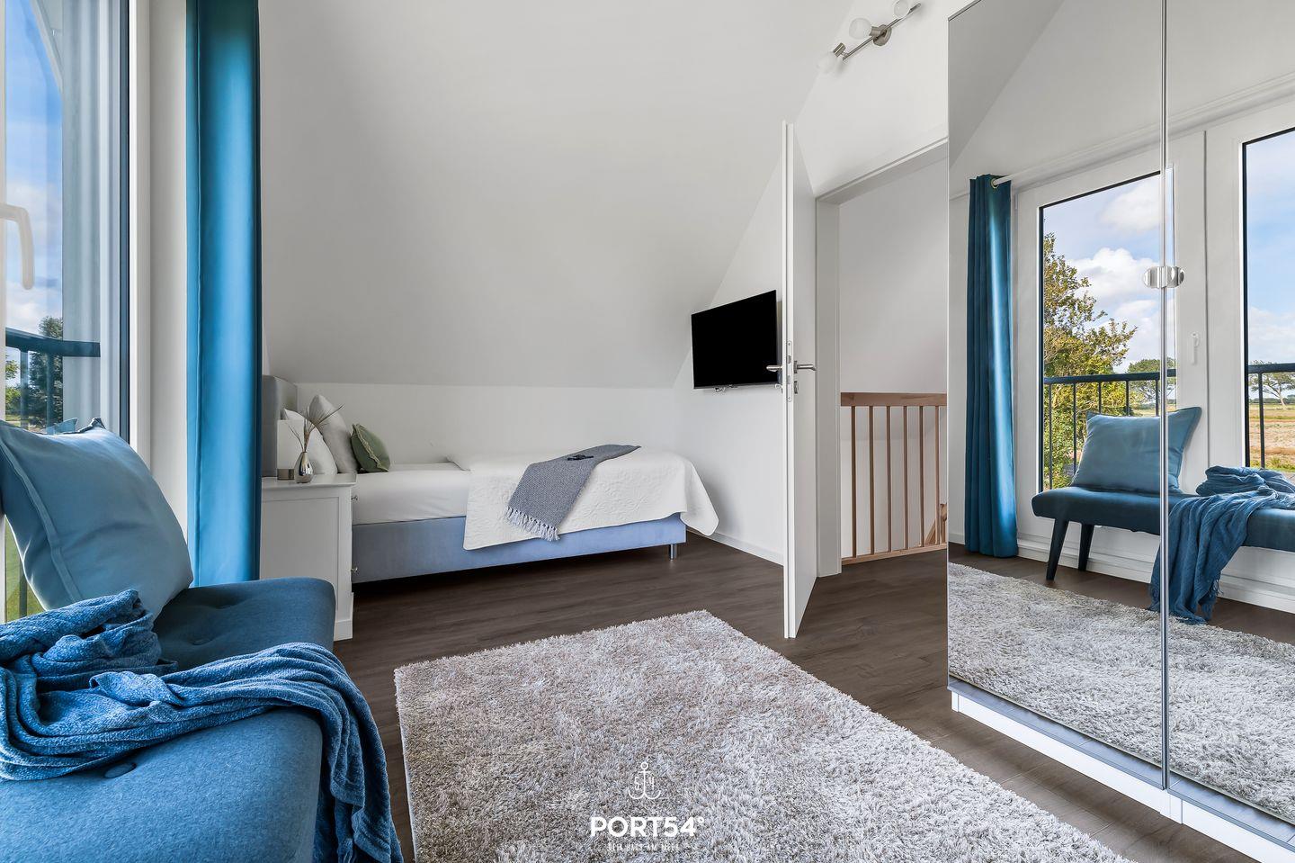 Schlafzimmer 2 ist sehr geräumig, mit Doppel-Boxspringbett, TV, Kleiderschrank, Relax-Liege, bodentiefe Fenster mit Verdunkelungsplissees sorgen für viel Tageslicht