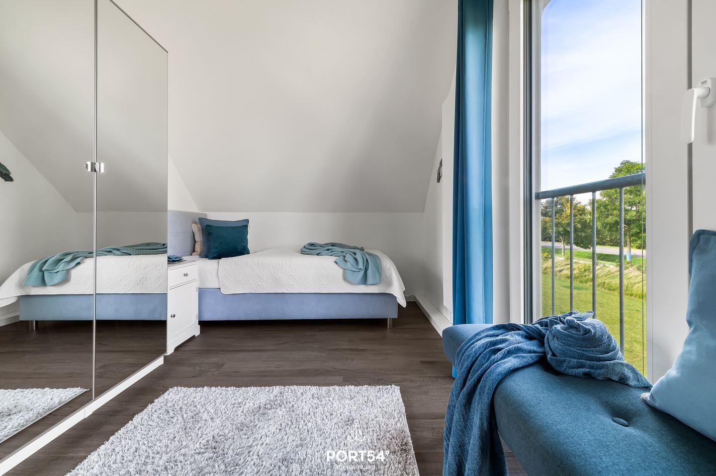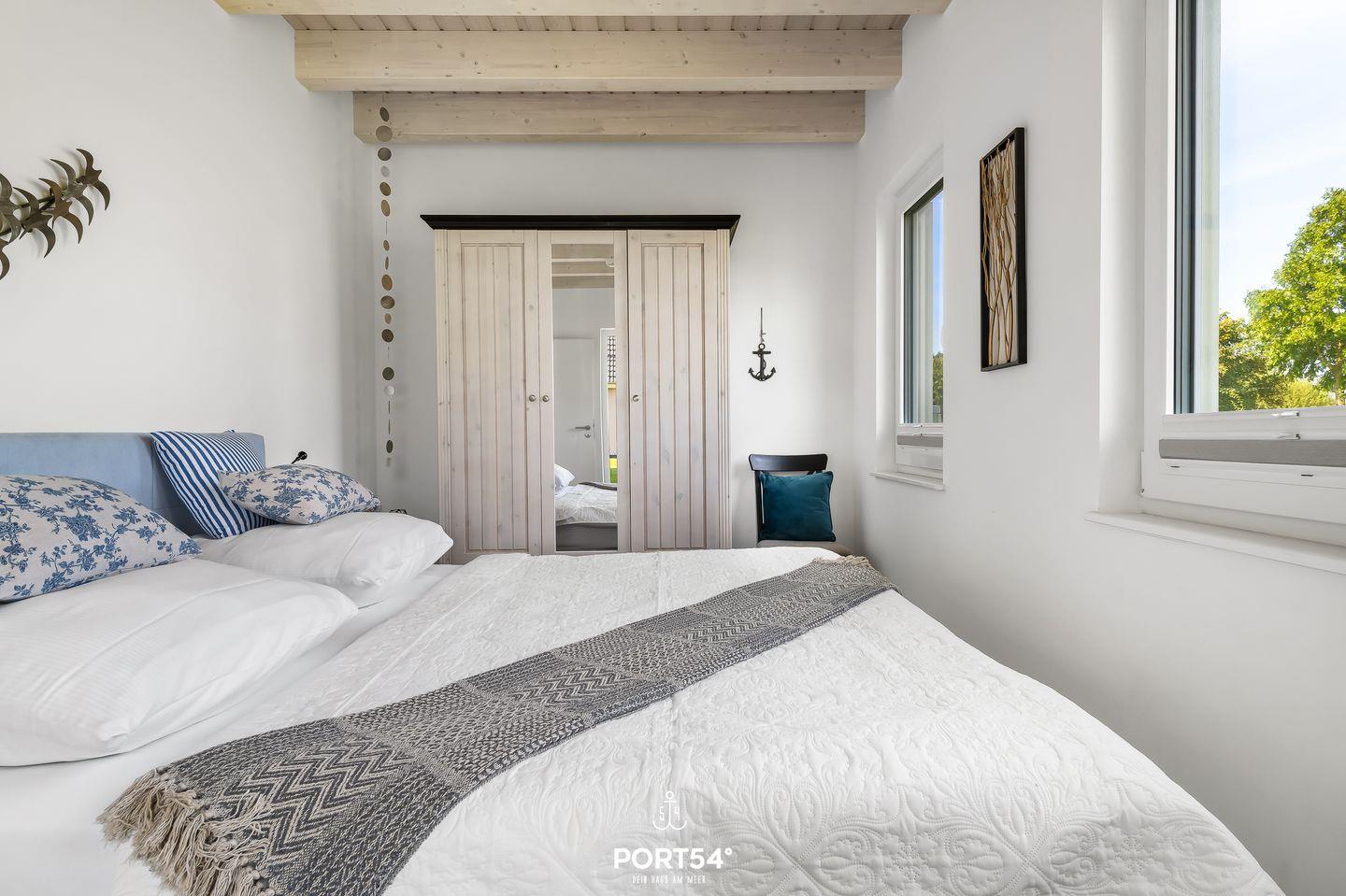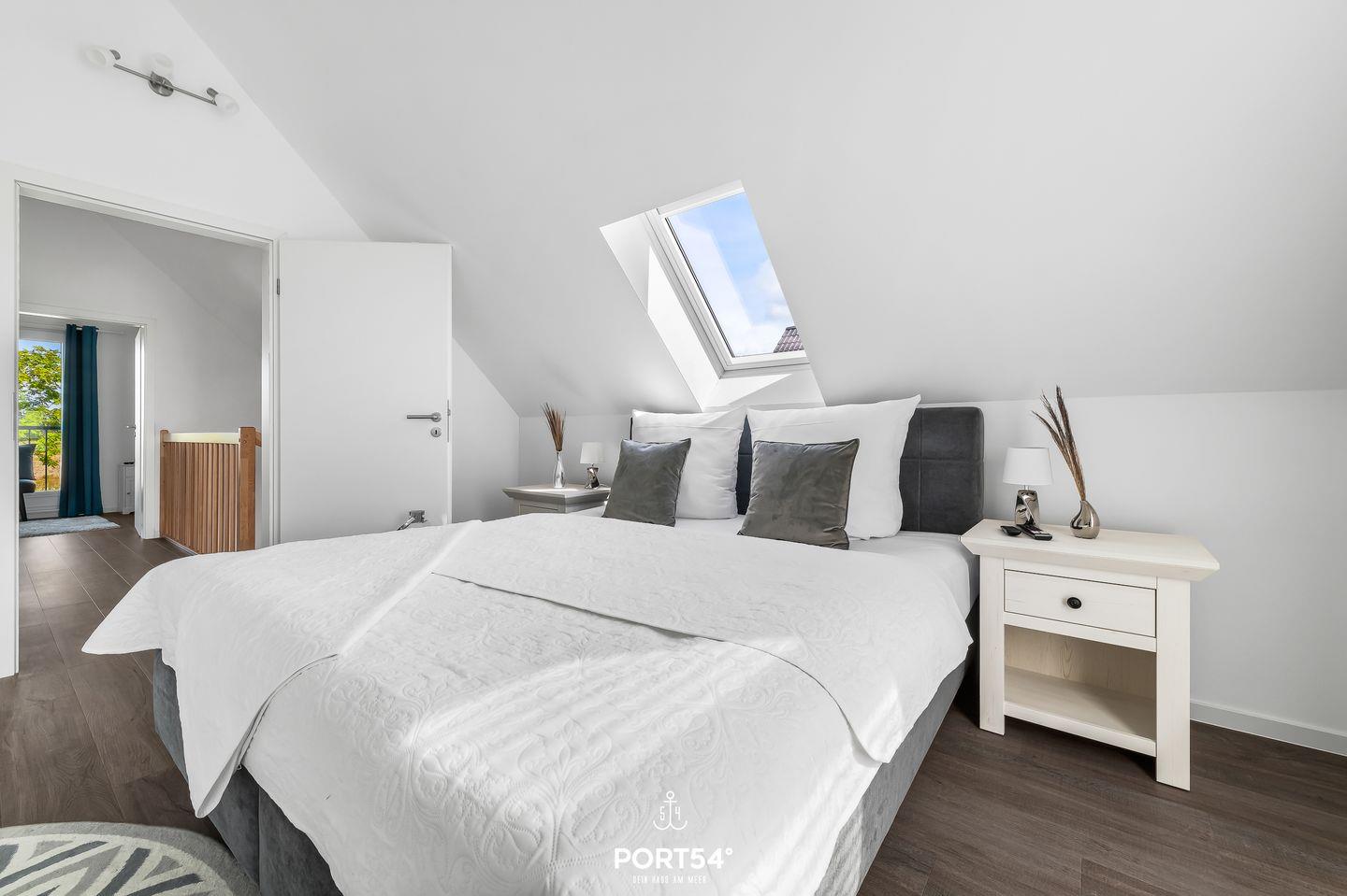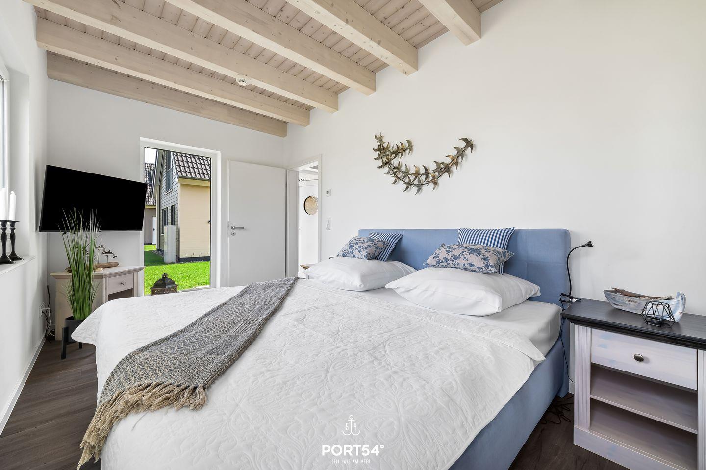 Schlafzimmer 2 ist sehr geräumig, mit Doppel-Boxspringbett, TV, Kleiderschrank, Relax-Liege, bodentiefe Fenster mit Verdunkelungsplissees sorgen für viel Tageslicht