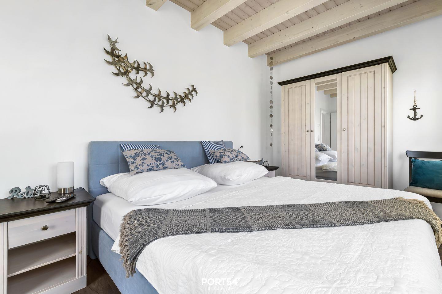 Schafzimmer 1 mit Doppel-Boxspringbett, TV, Kleiderschrank, Verdunkelungsplissees und einer gemütlichen hellen Holzbalkendecke