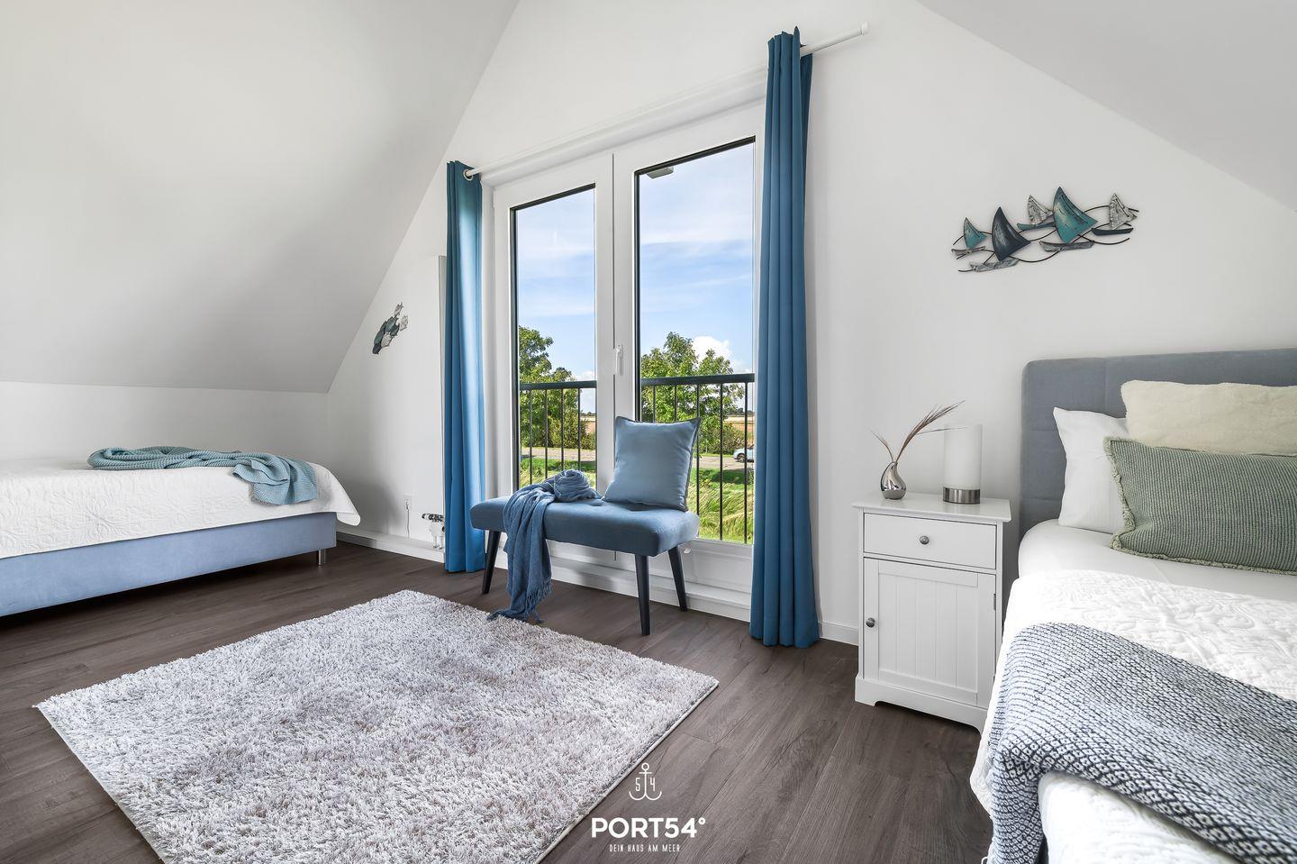 Schlafzimmer 3 mit 2 Einzelbetten, TV, Kleiderschrank und, bodentiefe Fenster mit Verdunkelungsplissees